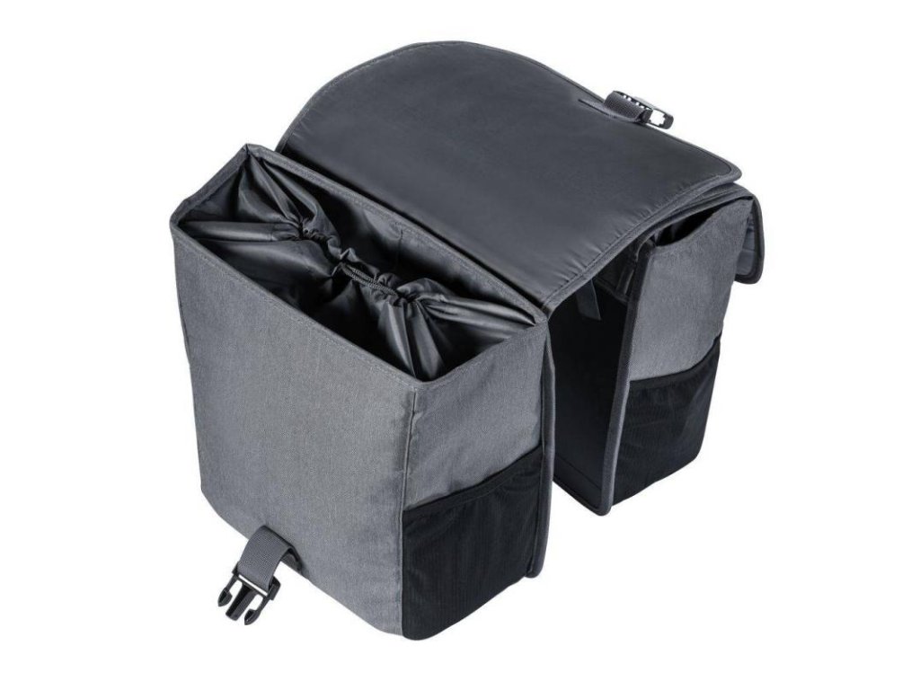 Dvojitá taška Basil GO je určená pre montáž na zadný nosič bicykla. Je ideálna na prepravu vašich potravín, alebo každodenných potrieb. Taška má priestrannú hlavnú priehradku, ktorú môžete zatvoriť šnúrkou spolu s elastickým vonkajším vreckom na každej strane. Je to užitočné, keď chcete vziať so sebou fľašu vody, alebo dáždnik.