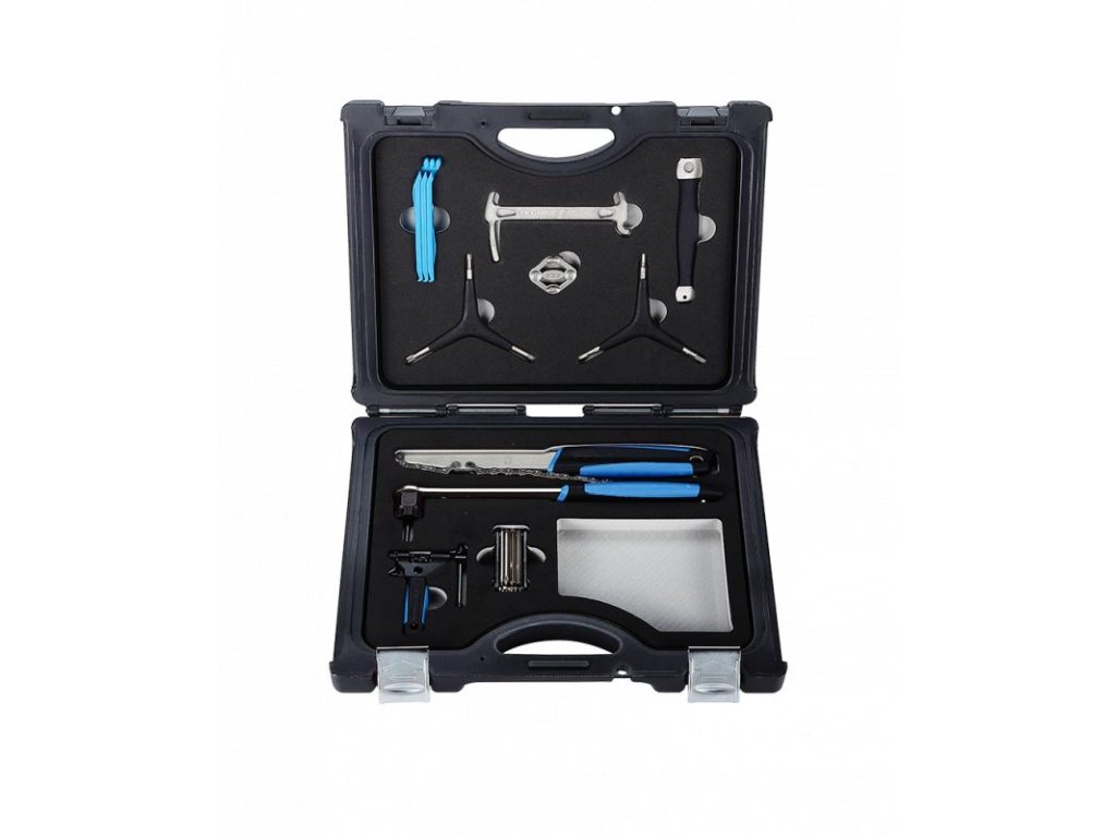 Extra pevné náradie. Servisný kufrík s desiatimi najbežnejšími nástrojmi pre starostlivosť o bicykel, BaseKit je perfektnou voľbou pre jazdcov, ktorí začínajú pracovať na svojom bicykli. Kufrík je vystlaný ochrannou penou tak, aby každý nástroj zostal na svojom mieste. Pridali sme aj extra priestor na maličkosti, alebo ďalšie nástroje, ktoré budete potrebovať.Sada obsahuje:Nitovač na reťaze BTL-05Nástroj na pridržanie kazety pri demontáži BTL-11Kľúč na demontáž kazety BTL-12SKľúč na centrovanie BTL-15Sadu imbusových kľúčov (4, 5, 6) BTL-28Sadu torx kľúčov (T25, T30, T40) BTL-28TKľúč na skrutky prevodníkov BTL-32LMini náradie (9 funkcií) BTL-40SMierku na reťaz BTL-125Montážne páčky BTL-81