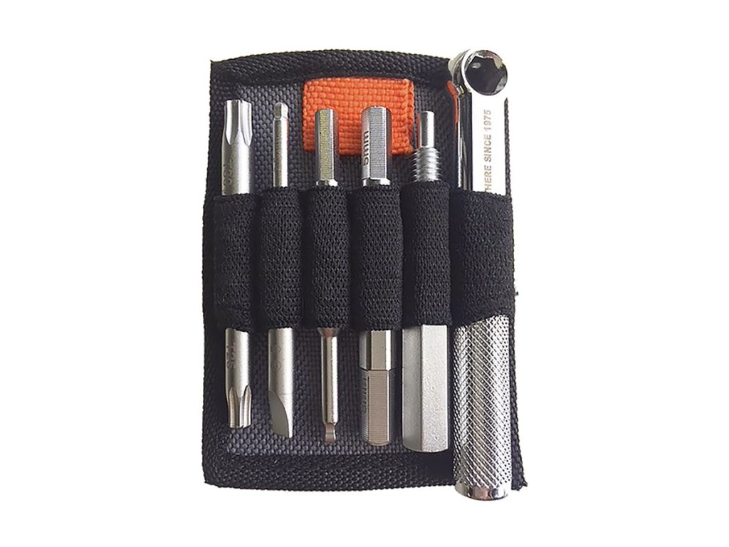 Unikátna sada 15 náradia vrátane praktického puzdra pod sedlo – všetko máte okamžite po ruke. NÁRADIE inbusy 2,5 / 3 / 4 / 5 / 6 / 8 mm • plochý skrutkovač • Torx kľúč T25 a T30 • nitovačka • centrovacie kľúče #0, #1 a #2 • oddeľovač brzdových doštičiek.