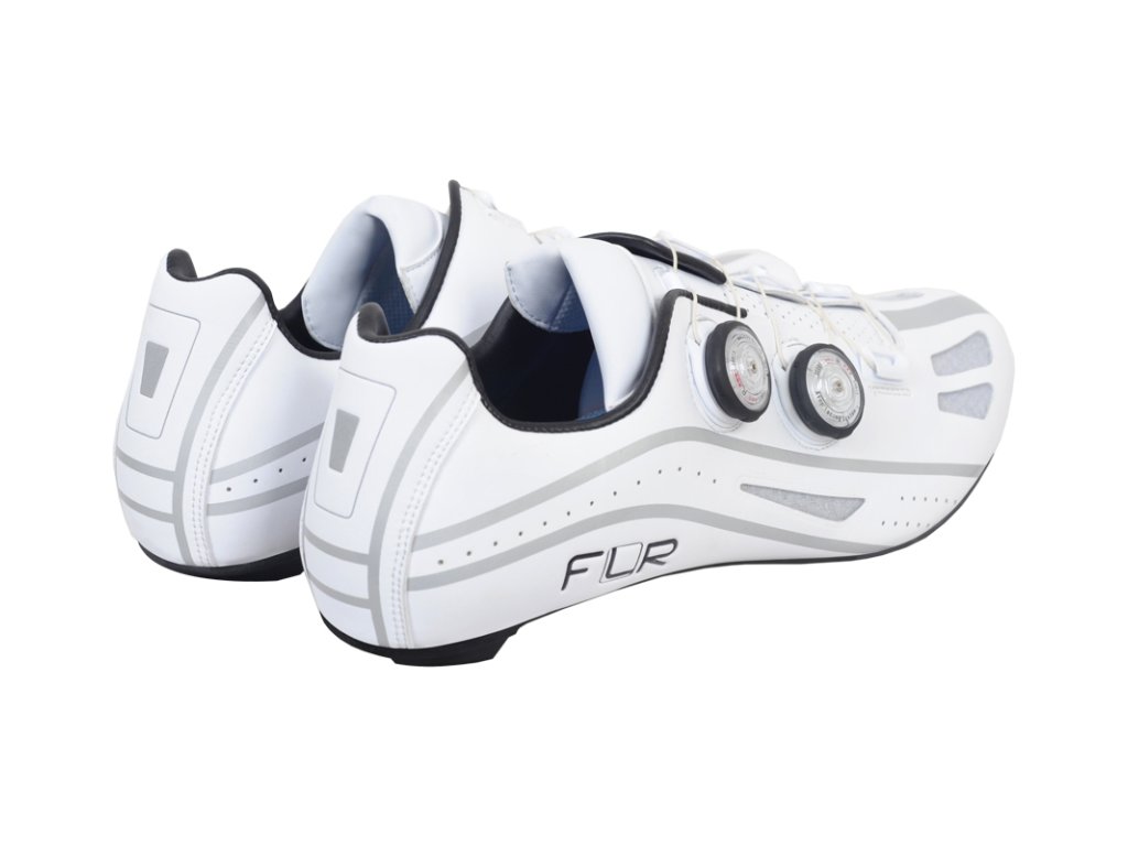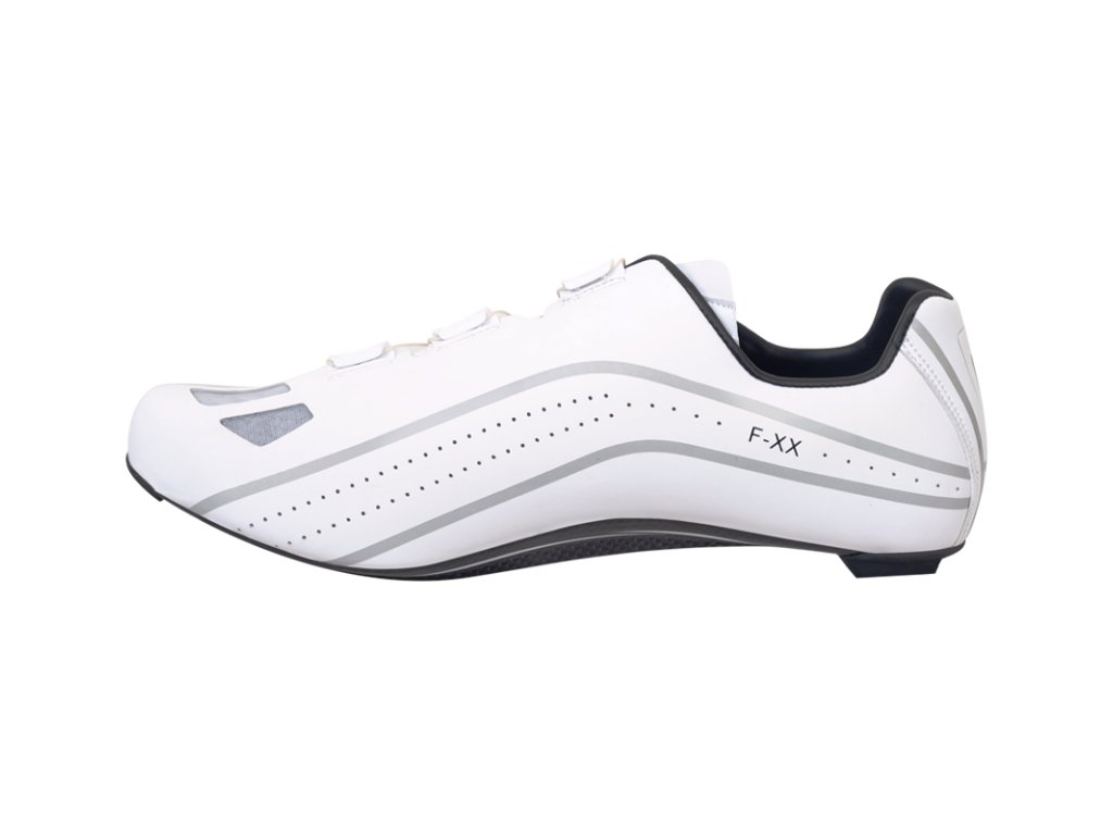 Model FXX sa stal víťazom ceny časopisu Cycling Plus v kategórii cestných tretier. Je ľahší, pevnejší, rýchlejší. A navrhnutý pre jediný cieľ: dosiahnuť maximálny výkon tuhým prenosom energie. Tieto tretry poskytujú komfort a vynikajú svojou aerodynamikou. Ich elegantný profil je vybavený podrážkou z tuhých karbónových vlákien R500 a tvarovaná stielka s podpornou pätou pomáha zvýšiť prietok krvi, obmedziť otlaky a zaistiť, aby každý watt energie putoval priamo do pedálov.Bezšvový zvršok je vytvorený z jedného kusu ľahkého mikrovlákna so šiestimi vložkami zo vzdušnej sieťoviny cez oblasť prstov a bočné panely. Perforácia po obvode zaisťuje v topánke rovnomerné prúdenie vzduchu a podporuje ventiláciu celého chodidla. Dva nezávislé otočné ovládače Atop optimalizujú upevnenie nohy v každej z kritických zón chodidla. Spodné koliesko zabezpečuje klenbu a prednú časť chodidla, zatiaľ čo horné koliesko blokuje členok a pätu. Model FXX je vybavený výkonnostnou vložkou Performance.Hmotnosť 226 g