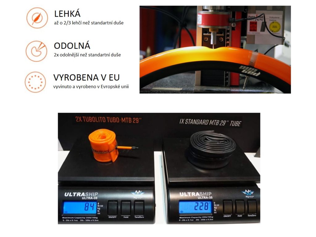 Tubolito je jedinečná superľahká duša, ktorá je ľahšia a odolnejšia vďaka použitiu inovatívneho materiálu. V porovnaní s klasickou dušou má výrazne vyššiu odolnosť proti procvaknutiu a váhovú úsporu 60 %! Ďalšou obrovskou výhodou je, že v porovnaní napríklad s latexovými dušami drží vzduch rovnako ako klasická duša! Tubolito je dvakrát odolnejšia duša proti prepichnutiu v teste ihlou pod tlakom. Hmotnosť 38 g - 40 g v závislosti od dĺžky ventilčeka Verzia s galuskovými ventilčekmi v dĺžke 42 mm, 60 mm alebo 80 mm Valivý odpor materiálu Tubolito je o 4,6 W nižší pri rýchlosti 28,8 km/h ako pri bežnej duši Drží vzduch rovnako ako klasická duša. Pre plášte 18 - 28 mm Tubolito môže byť dočasne nafúkaná CO2, ale odporúča sa ju po dojazde bezodkladne vypustiť a nafúknuť klasickým vzduchom.Inštaláciu do ráfika vykonávajte s Tubolito nafúknutou na 0,2-0,5 baru. Nafúknutie na túto hodnotu vykonajte mimo ráfik a dbajte na to, aby ventilček smeroval dovnútra, aby nedochádzalo k zbytočnému namáhaniu materiálu.