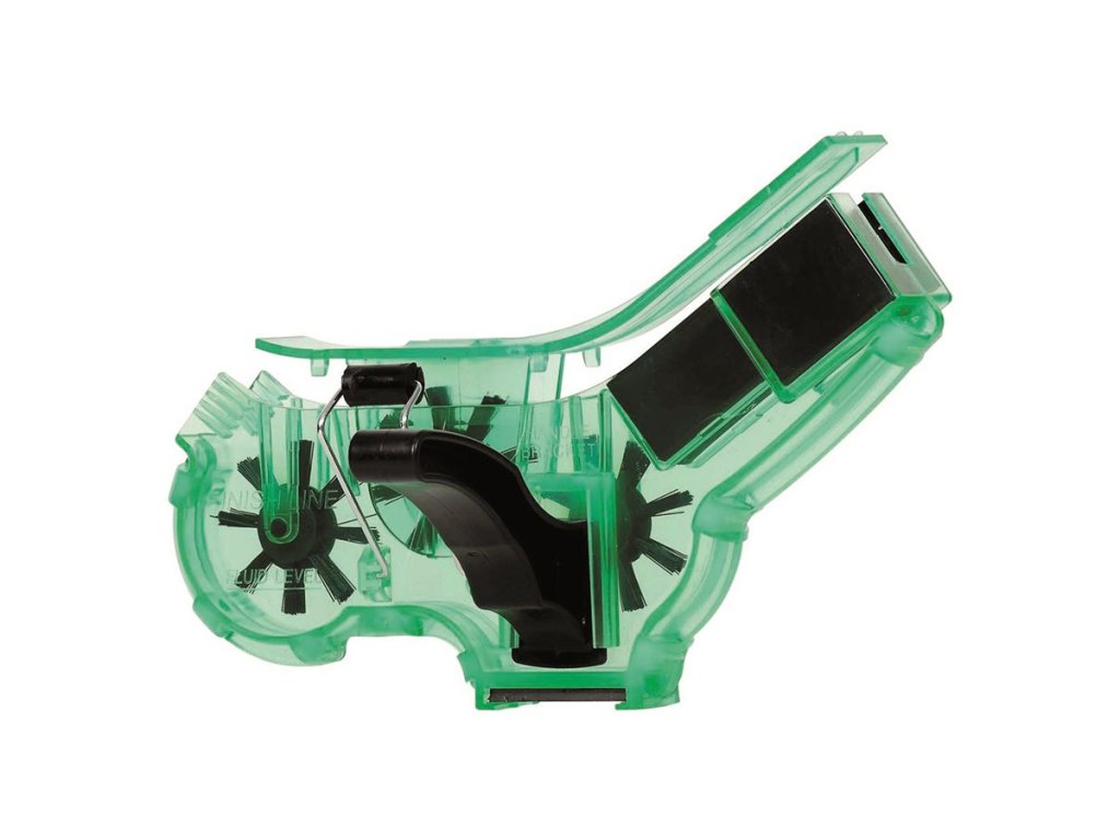 Nová vylepšená umývačka reťazí má tri rotujúce kefy. Vďaka stierkam na výstupe z umývačky reťaz nevytahuje čistiaci prostriedok von. Umývačka má na dne silný magnet, ktorý pri umývaní priťahuje kovové zvyšky a triesky. Nie je potrebné demontovať reťaz. Umývačka sa nasadí na reťaz, ktorý je počas krátkeho času umývania úplne čistý. Umývačka sa ľahko nasadzuje aj sníma z reťaze a má odnímateľnú rukoväť. Sada obsahuje 120 ml účinného odmasťovača EcoTech® 2 a 60 ml univerzálneho maziva Teflon™ Plus. Čistiace kefy sú vymeniteľné.