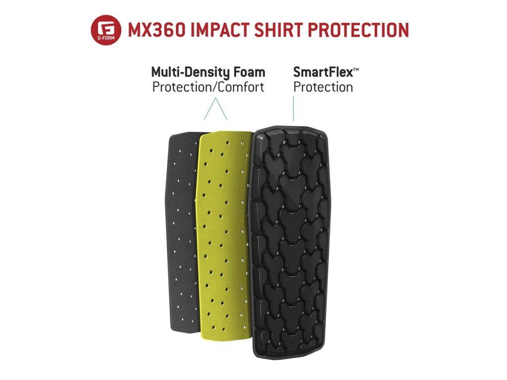 Lehké celorozepínací triko G-Form s ochranou ramen, žeber a odnímatelným chráničem páteře. Triko je z lehkého materiálu, který skvěle odvádí přebytečné teplo, větrá a nabízí tak pohodlí i při celodenním zápřahu v bikeparku, ale zároveň je dostatečně odolný, aby přežil i nějaký ten pád. Chránič ramen a žeber je vyroben z nového materiálu SmartFlex Stretch, který se ještě lépe přizpůsobí vašemu tělu a všelijakým pohybům, a přitom ho dokáže ochránit v případě pádu stejně dobře jako standardní pěna SmartFlex. Tato pěna je pak použita na odvětraném a odnímatelném chrániči páteře společně se spodní vrstvou z měkké pěny pro výjimečný komfort nošení a bezchybnou ochranu páteře. Charakteristická funkce pěny SmartFlex zůstává stejná i zde: během jízdy je flexibilní, skvěle se přizpůsobí tělu, neomezuje v pohybu a až v okamžiku pádu celá ztuhne, vytvoří pevný chránič, rozprostře tlak nárazu na větší plochu a ochrání tím jezdce před poraněním.