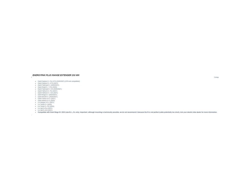Přídavná baterie EnergyPak Plus s kapacitou 250 Wh navýší dojezd elektrokola o nezanedbatelnou porci kilometrů nebo výškových metrů. Baterie EnergyPak Plus je kompatibilní s určitými modely elektrokol Giant a Liv, je tedy potřeba si předem ověřit kompatibilitu s vaším elektrokolem Giant nebo Liv.