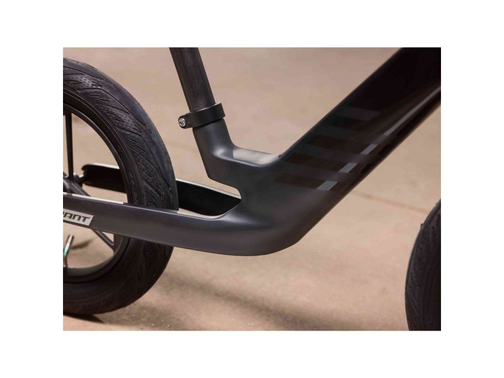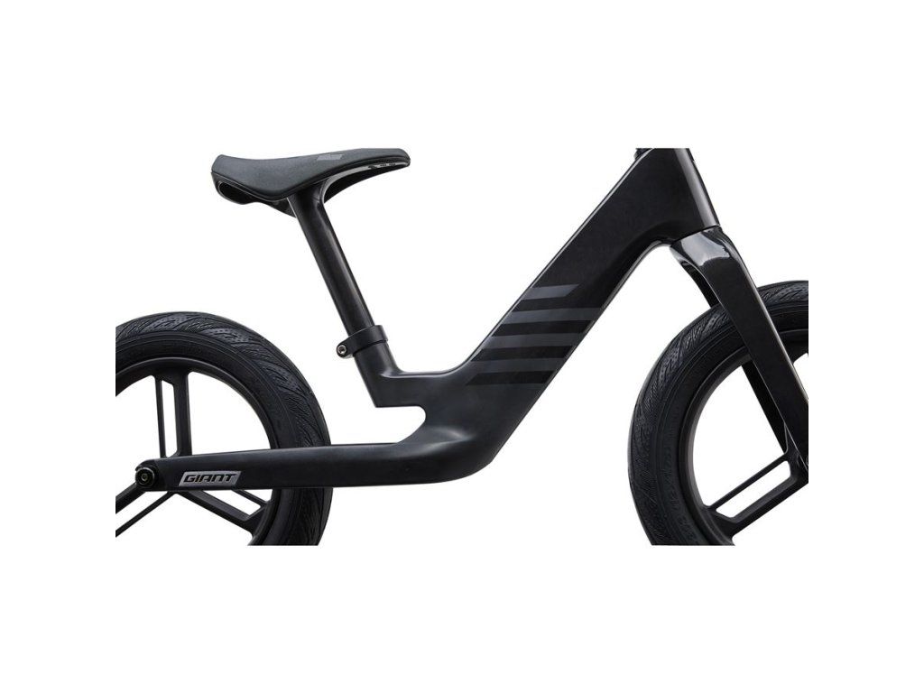 Karbonový rám je navržen s nízko umístěným těžištěm a geometrií, která dětem umožňuje přirozenou a efektivní pozici při jízdě. Vidlice má mírně strmější úhel, aby se zlepšila průjezdnost zatáčkami, hbitost a rychlost. Odrážedlo tak kombinuje vysokou stabilitu s hravou ovladatelností a rychlostí. Jedinečná 12palcová karbonová kola využívají náboje s nízkým třením a 1,75“ pláště s jemným vzorkem vhodným na různé povrchy.