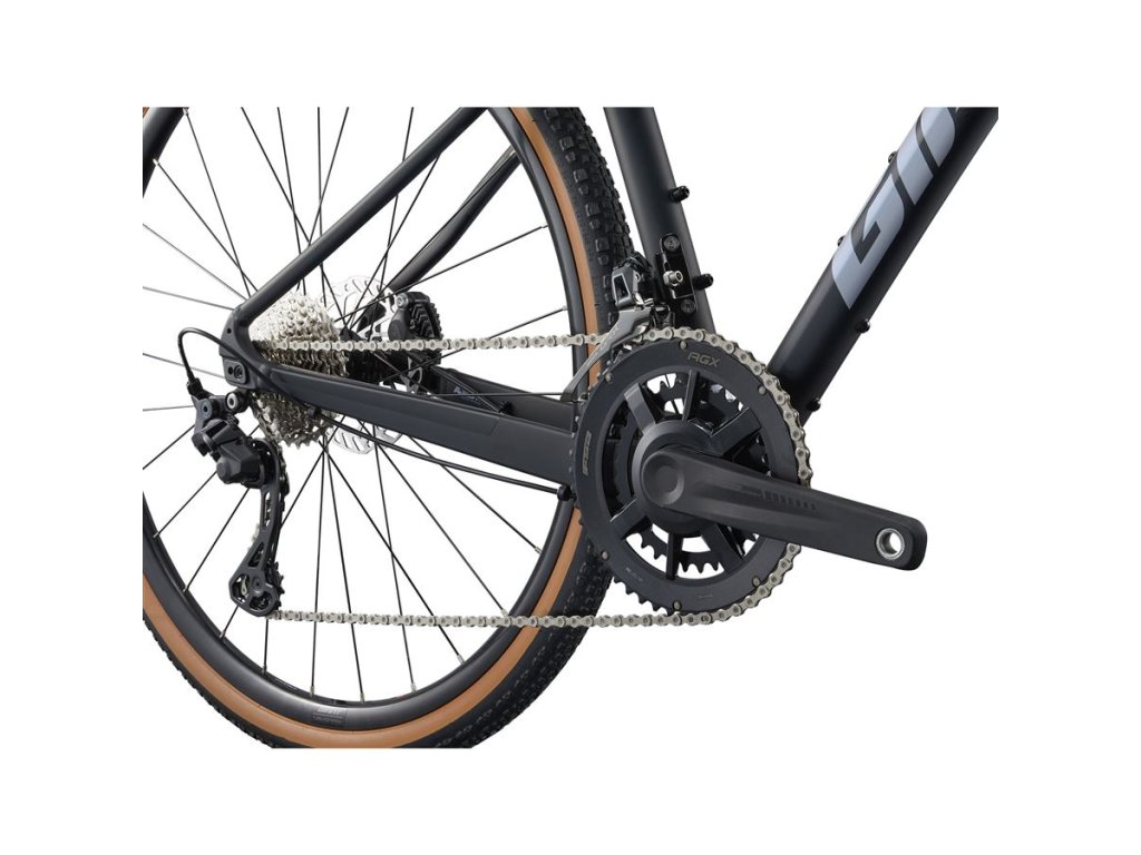 Všestranný a pohodlný gravel bike Revolt bude perfektným spoločníkom pri objavovaní ciest a chodníkov, o ktorých ste vždy premýšľali, ale nikdy po nich nejazdili. Jeho pohodlný hliníkový rám s karbonovou vidlicou poskytuje možnosť zmeny rozvoru kolies a tiež možnosť použitia teleskopickej sedlovky. Hlavné prednosti Hliníkový rám s modernou geometriou Ľahký hliníkový rám ALUXX spolu s celokarbonovou vidlicou prináša dokonalú rovnováhu tuhosti pre čo najvyššiu efektivitu šliapania a poddajnosti pre vysoký komfort. Geometria kombinuje vytrvalostnú jazdnú pozíciu s kratšou zadnou stavbou pre precízne ovládanie, hbitosť a dokonalú kontrolu nad bicyklom. Dlhší reach, kratší predstavec a nižšie strede zlepšujú stabilitu v hrubšom teréne. Vysoký komfort Rám má nižšie umiestnené sedlové vzpery menšieho priemeru pre ešte lepšie pohlcovanie nárazov a vibrácií. K vyššiemu komfortu pomáha tiež špeciálne tvarovaná sedlovka D-Fuse a riadidlá Contact XR D-Fuse – oboje spolu funguje ako systém a pod záťažou mierne pruží, avšak bez zníženia tuhosti pri zatáčaní, stúpaní alebo jazde zo sedla. Prispôsobenie bicykla podľa terénu Zadné patky umožňujú vďaka systému flip chip meniť rozvor kolies. Kratší rozvor prináša vyššiu „hbitosť“ bicykla, nastavenie na dlhší rozvor zlepšuje stabilitu pri vyšších rýchlostiach a súčasne zväčšuje priestor pre zadný plášť (až na 53 mm). Rám umožňuje tiež voľbu typu sedlovky – dá sa použiť buď „pružiaca“ sedlovka Giant D-Fuse alebo štandardná guľatá sedlovka 30,9 mm, teda aj teleskopická. ŠPECIFIKÁCIA RÁM VEĽKOSŤ XS FARBA Black/Moonstone RÁM ALUXX-grade hliník, 12x142mm thru-axle, disc, flip chip dropout VIDLICA Advanced-grade kompozit, full-composite OverDrive steerer, 12mm thru-axle, disc KOMPONENTY RIADIDLÁ Giant Contact XR D-Fuse, 31.8mm XS:42cm, S:42cm, M:44cm, M/L:44cm, L:46cm, XL:46cm GRIPY korková páska s gélom PREDSTAVEC Giant Contact, 8-stupňový XS:50mm, S:60mm, M:70mm, M/L:80mm, L:80mm, XL:90mm SEDLOVKA Giant D-Fuse, zliatina, 14mm offset SEDLO Giant Approach OSAZENIE ŘAZENÍ Shimano GRX RX-610, 2x12 PŘESMYKAČ Shimano GRX RX-820 PŘEHAZOVAČKA Shimano GRX RX-820 BRZDY Shimano GRX RX-410 hydraulické, Giant MPH rotory [F]160mm, [R]160mm BRZDOVÉ PÁKY Shimano GRX RX-610 hydraulické KAZETA Shimano 105, 11x34 ŘETĚZ KMC X12L-1 KLIKY FSA Omega Modular AGX+, 32/48 XS:170mm, S:170mm, M:172.5mm, M/L:172.5mm, L:175mm, XL:175mm STŘED FSA Mega EXO KOLA RÁFKY Giant S-X2 Disc wheelset, zliatina NÁBOJE Giant zliatina, 12mm thru-axle DRÁTY nerezové PLÁŠTĚ Giant Crosscut Grip TR, 700x40c, tubeless DOPLŇKY tubeless pripravené, 53mm max veľkosť plášťa v 'dlhej' flip chip pozícii, 45mm max veľkosť plášťa v 'krátkej' flip chip pozícii.