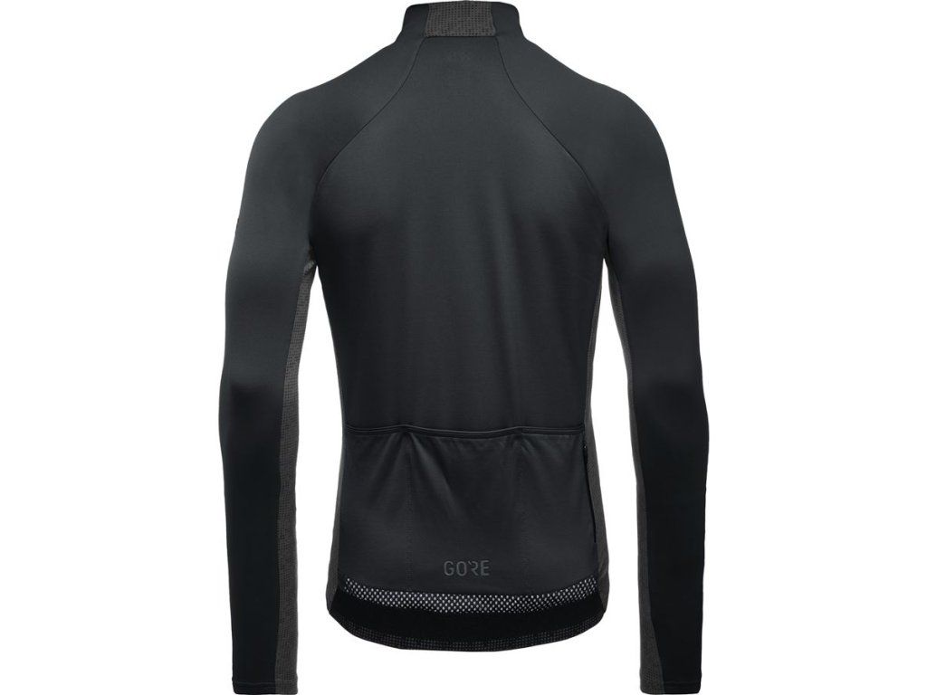 Zónové rozdělení tkanin - přední část termo-izolační látka, méně hřejivé boční panely a ve spodní části rukávů, vsadka ze síťoviny v zadní části zajišťuje odvětrávání