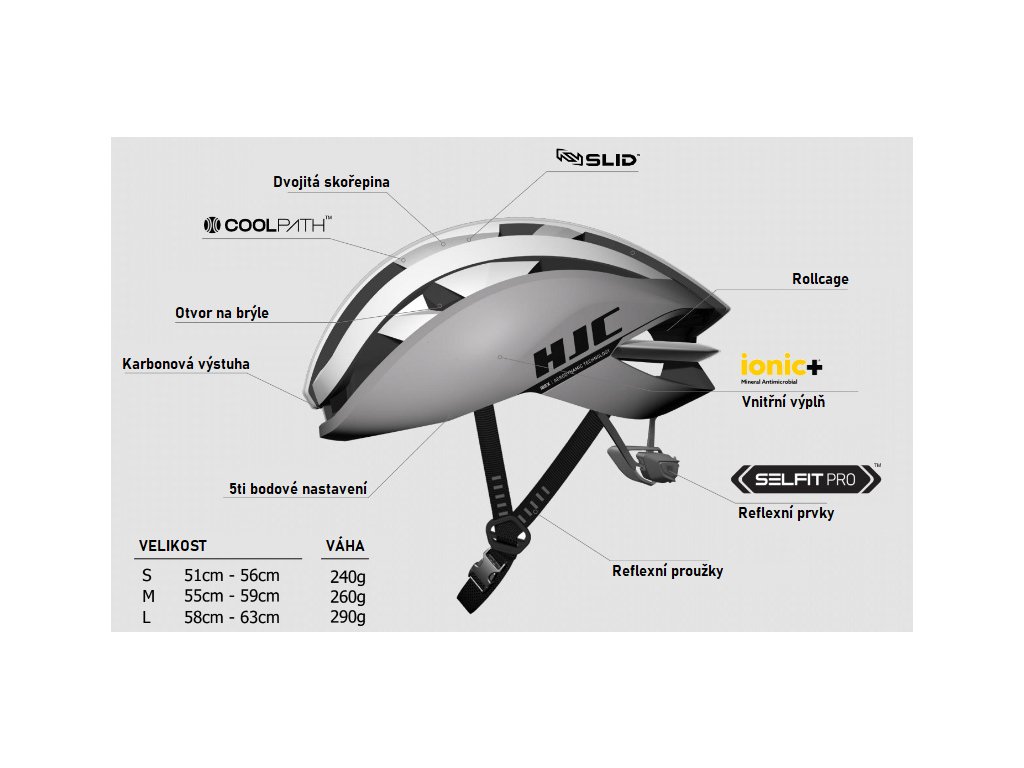 IBEX 3 je vrcholovým zástupcem nejnovějších technologií od HJC, navrženým tak, aby jezdci poskytoval tu nejvyšší kvalitu, bezpečí a konkurenční výhodu. Je prvním svého druhu, který přináší revoluční technologii SELFIT PRO, kombinující automatický systém přizpůsobení s možností mikronastavení. Kromě toho obsahuje inovativní technologii SLID, která minimalizuje rotační nárazy a zajišťuje maximální bezpečnost.Model IBEX 3 ztělesňuje esenci technologie HJC s označením COOLPATH, která umožňuje, aby chladný vzduch optimálně proudil kolem vaší hlavy během jízdy tím, že nahrazuje vnitřní podšívku. S nižší hmotností a lepší ventilací poskytuje IBEX 3 vynikající výkon.VLASTNOSTI HELMY:SELFIT PRO – automatický samonastavovací systém, který představuje revoluční technologii v oblasti montáže cyklistických helem. Jakmile je helma nastavena na vaši hlavu, nevyžaduje další nastavení, a to ani v případě, že se vaše hlava během jízdy pohybuje. Systém SELFIT automaticky nastaví mezeru a zajistí konzistentní přizpůsobení a pohodlí pro vaši hlavu. Pět poloh snap fittingu zajišťuje konzistentní přizpůsobení a pohodlí pro všechny různé typy tvarů a velikostí hlavy.Microkolečko umožňuje ještě lepší nastavení a regulaci velikosti i v průběhu jízdy. Jezdec může přesně nastavit přizpůsobení, výsledkem je helma, která bude ideálně přizpůsobena pro dokonalou jízdu pokaždé, když se jízda opakuje.COOLPATH – nová technologie nahrazující vnitřní polstrování, která umožňuje proudění chladného vzduchu kolem hlavy a zvyšuje pohodlí během jízdy. Proudění chladného vzduchu a lehkost helmy zlepšují přizpůsobení a poskytují vynikající zážitek z jízdy. Určité množství vzduchu prochází předním nasávacím otvorem, poté cirkuluje uvnitř helmy a nakonec vychází výfukovým otvorem. Vnitřní proudění vzduchu se tak zvýší, aby ochladilo hlavu a odvedlo teplo.SLID – společnost HJC vyvinula bezpečnostní prvek přidáním speciálního materiálu GEL. SLID je umístěn ve vnitřním prostoru helmy, aby snížil množství energie dodávané do mozku tím, že zajišťuje rotační funkci. Pokročilý materiál GEL uvnitř vložky SLID má tekoucí vlastnosti. Díky tomu je možné rozptýlením nárazu dosáhnout minimálních sil a energie dopadající na mozek.