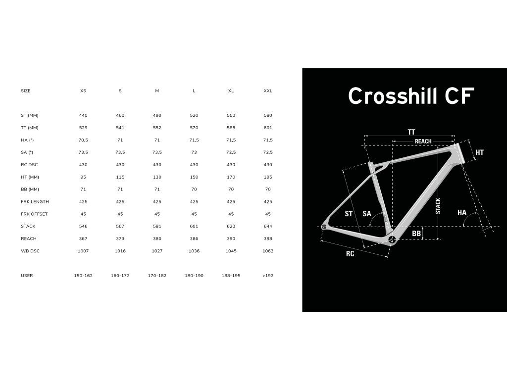 Karbonový Crosshill CF je navrhnutý pre rýchlosť a citlivosť, bez toho, aby obetoval stabilitu alebo pohodlnú pozíciu na dlhé vzdialenosti. Nový Crosshill CF dokonale spĺňa predstavu o pohodlí a výkone pri jazde na gravel bicykli, či už na rovných úsekoch, alebo v technických a strmých pasážach, aby sa každý jazdec cítil sebavedomo.Karbonový rám3D Tubular™ je unikátne a logické spojenie sedlových vzpier s hornou rámovou trubkou ďaleko pred sedlovkou, čo ponecháva sedlovú trubku po celej jej dĺžke voľnú a umožňuje lepšie tlmiť vibrácie a dodáva jazdcovi potrebný komfort. Samotné sedlové vzpery sú navrhnuté tak, aby poskytovali vertikálnu flexibilitu vďaka ich eliptickému tvaru a dvojitému ohybu v tvare písmena S v hornej časti, čo zvyšuje absorpciu vibrácií. Hmotnosť rámu: 1000 g (veľkosť M pred lakovaním). Rám je pripravený na upevnenie blatníkov, brašien a aj vidlica má prípravu na montáž svetla, blatníka alebo ľahkého nosiča. Francúzska značka Lapierre myslela aj na veľmi vysokých jazdcov (195 cm +) a zaradila do ponuky aj veľkosť XXL.Široká ponuka 7 modelovV rade Crosshill CF je sedem modelov, pričom dva majú odpružené vidlice so zdvihom 30 a 40 mm na náročnejšie použitie v horách alebo na kamenitých cestách. Nižšie modely sú vybavené mimoriadne pohodlnými hliníkovými riadidlami (rise: 12 mm, drop: 114 mm). Vyššie modely majú karbonové riadidlá, ktoré umožňujú športovejšiu pozíciu. Kabeláž vchádza do rámu už v predstavci, čo ničím nenarúša dokonalý vzhľad.Elektronické radenie pre lepší výkonElektronické sady SRAM AXS (Apex XPLR, Rival XPLR, Force XPLR) alebo nové radenie Shimano GRX Di2 sú dostupné pri piatich modeloch a zaisťujú spoľahlivé a presné radenie za všetkých okolností. Ideálne pre športové a výkonnostné použitie.Jednoprevodník alebo dvojprevodník, vyber si sámMáš nejaké preferencie? Crosshill ponúka obe možnosti. Dvojprevodník pre modely Shimano GRX (mechanické aj Di2), jednoprevodník pre modely SRAM AXS XLPR. Všetky rámy sú kompatibilné s oboma možnosťami.• Kompatibilný s plášťami 45 mm• Patka SRAM UDH• Karbonové riadidlá pri modeloch 7.0 a 8.0. Drop: 122 mm / 20 mm rise / 12° flare• Hliníkové riadidlá pri modeloch 5.0 a 6.0. Drop: 114 mm / 12 mm rise / 12° flare• Tubeless ready plášte aj ráfiky• Odnímateľný spoj medzi sedlovými vzperami na montáž blatníka• Schválený pre UCI preteky