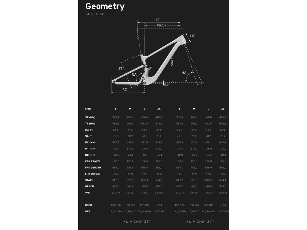 Od svojho prvého uvedenia na trh v roku 2007 je Zesty navrhnutý ako all-mountain bicykel stvorený pre zábavu na singletrailoch, prekonávanie náročných prekážok, rýchle zdolávanie kopcov a vzrušujúce skoky pri ešte rýchlejších zjazdoch. Nie je nutné byť vždy prvý, stačí nasadnúť na nový Zesty CF a zistíte, že môžete byť lepší ako kedykoľvek predtým.Lapierre Zesty CF. Čistokrvný all-mountain bicykelAll-mountain bicykle svojimi vlastnosťami spadajú medzi XC maratónske a Enduro bicykle. Musia byť ľahké, čo najbližšie jazdným kvalitám XC maratónskych bicyklov, a zároveň musia mať rýchle zjazdové vlastnosti ako enduro stroje.Zdvih 150/150 mm je viac než postačujúci a naprieč všetkými generáciami sa menil minimálne. Avšak kinematika a najmä geometria sa v novej generácii prispôsobili súčasným požiadavkám na horské bicykle a evolúcii all-mountain bicyklov: za každých okolností zlepšiť jazdu po rovine a do kopca, pričom si zachovávajú čo najlepšie zjazdové vlastnosti. Lapierre sa preto rozhodol zachovať koncept pôvodného modelu Zesty, no úplne prepracovať rám tak, aby bol v súlade s dobou. Celý vývoj nového bicykla bol založený na novej kinematike, okolo ktorej sa projekt nového Zesty točil.Odpruženie v srdci projektu Zesty CFŠtvor-čapové odpruženie je ideálne pre all-mountain bicykle, preto ho Lapierre využil aj u Zesty CF. Lapierre sa pokúsil nájsť nový spôsob, ako vylepšiť kinematiku na oboch stranách extrému – tak, aby bolo odpruženie citlivejšie na začiatku zdvihu a progresívnejšie na jeho konci. Tým sa zabraňuje príliš rýchlemu dosiahnutiu konca zdvihu, čo znižuje zbytočné nárazy a nepohodlie pri jazde v náročnom teréne. Nový rám bol navrhnutý tak, aby poskytol dostatok priestoru pre väčší vzduchový tlmič s najnovšími technológiami, ako je špičkový RockShox’s Flight Attendant System (u modelu Zesty 10.9), ktorý pomocou senzorov na bicykli vyhodnocuje terén a štýl jazdy a automaticky prispôsobuje nastavenie odpruženia pre maximálnu efektivitu, výkon a pohodlie.All-mountain geometriaNový Zesty CF je navrhnutý tak, aby jazdcovi poskytol čo najväčšiu sebadôveru a umožnil mu relaxovať aj v technicky náročných podmienkach a pri vysokej rýchlosti. Geometria presunula ťažisko dozadu a vyvážila stred bicykla. To zlepšilo efektivitu šliapania na zvlnených úsekoch a znížilo riziko preklopenia na strmých svahoch. Technológia FlipChip umožňuje zvýšiť odozvu zadnej časti bicykla, napríklad zmenou na 27,5“ zadné koleso, bez straty výhod geometrie.Špecifikácia geometrie Zesty CF:Oveľa strmší uhol sedlovky (+3,7°), skrátená horná trubka (od 5 mm po 49 mm podľa veľkosti S až XL) a dlhší reach (+20 mm pri všetkých veľkostiach).Krátka zadná stavba 432 mm (430 mm pre 27,5").Dlhší rázvor kolies (+30 mm).Vyššia hlavová trubka.Technológia FlipChip umožňuje použitie Mullet setupu alebo 29“ kolies.Tuhosť pod kontrolouAby Zesty CF obstál v all-mountain segmente, zvýšila sa jeho tuhosť pre lepšiu presnosť a cit pri zjazdoch, pričom sa zachovala ľahkosť a zlepšil sa výkon pri šliapaní. Tento cieľ sa podarilo dosiahnuť prémiovou UD SLI karbónovou konštrukciou rámu (modely 8.9 až 10.9).Karbónová konštrukciaKarbónový rám Zesty CF 2025 využíva tri typy karbónových vlákien: T800, M40J a T700. Využitie unikátnych PU a PP trnov umožnilo optimálne rozloženie viac ako 500 vrstiev karbónu. Výsledkom je vysoký výkon, presnosť a dokonalá tuhosť. Holý rám váži len 2,5 kg.Project Gravity LogicLapierre zachoval a vylepšil Tool Box – úložný priestor na spodnej rámovej trubke, ktorý eliminuje dopad váhy nástroja na jazdný dojem a chráni rám pred poškodením.Modelová rada Zesty CF 2025Zesty CF 2025 ponúka 5 úrovní výbavy s dôrazom na vysokú kvalitu a rýchlu odozvu v náročných podmienkach:Zdvih 150 mm (predný/zadný).Vidlica 36 mm.Rôzne veľkosti kolies (2,50 predné / 2,40 zadné).Štvorpiestové brzdy s 203/180 mm kotúčmi.Prevodník 32 T.