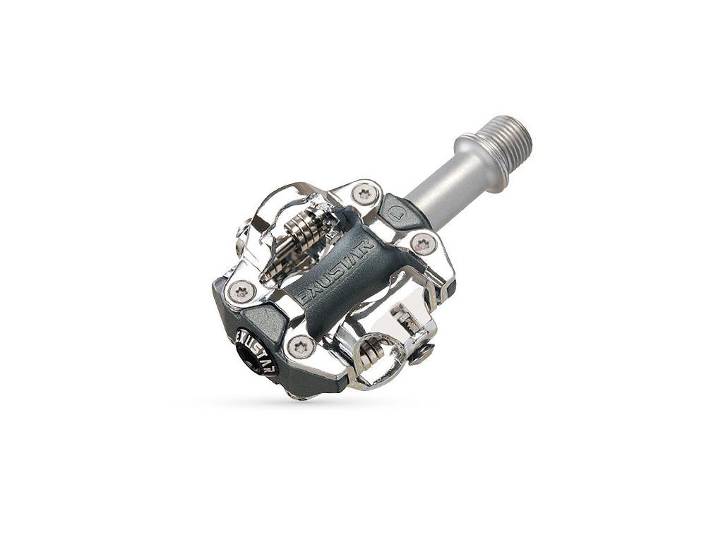 Ľahké pedále Exustar PM213 s vynikajúcim pomerom cena/hmotnosť/kvalita. Kompatibilný so štandardným systémom SPD.Hliníkové teloCr-Mo os opracovaná CNCLSL tesnenia - priemyselné ložiskáSPD obojstranný upínací mechanizmusBrzdy (kufríky) súčasťou balenia E-C05FStrieborná farba