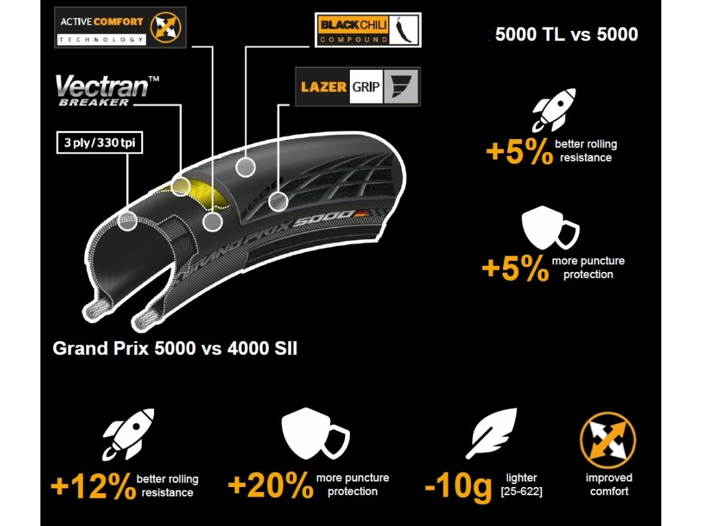 Continental Grand Prix 5000 je nový cestný plášť pre pretekárske použitie, ktorý nahrádza legendárny a v profi pelotóne najpoužívanejší Grand Prix 4000. Vďaka mnohým rokom vývoja sa podarilo znížiť hmotnosť a valivý odpor plášťa a zvýšiť jeho odolnos