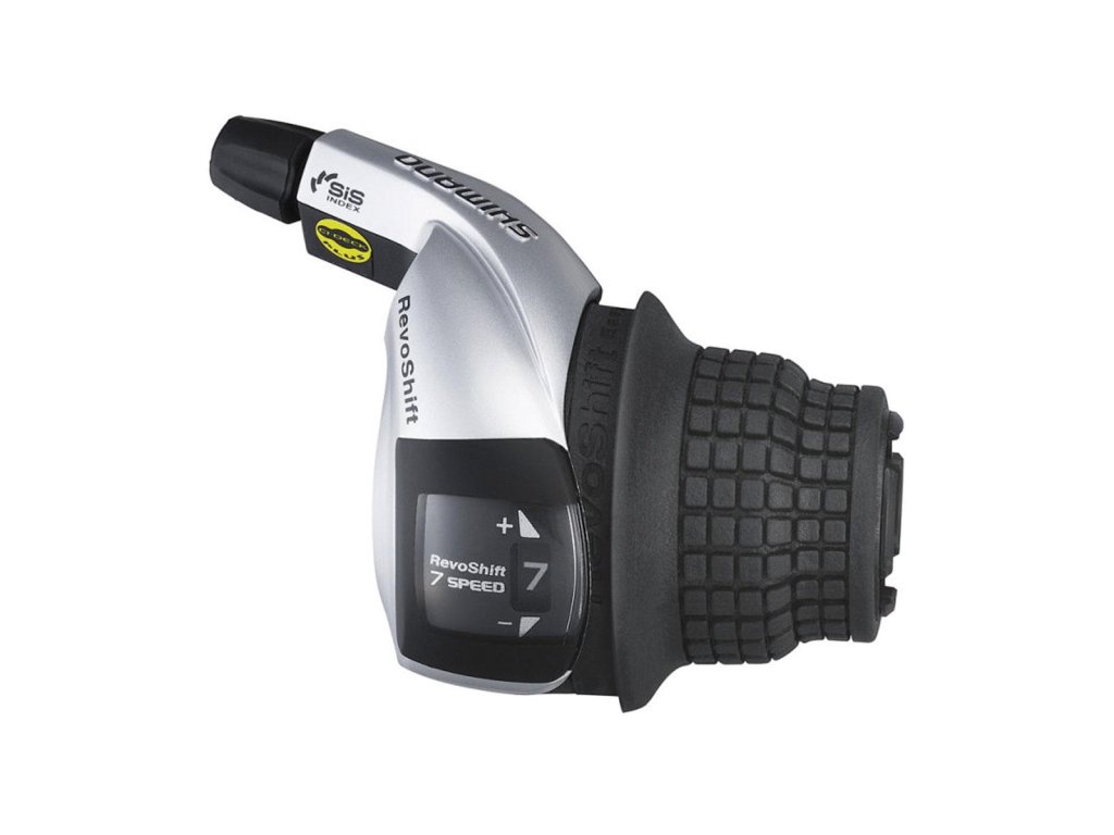Typ: MTB, Celková váha balenia: 198g, 7 rýchlostné, Pravé, Revo Shift, Typ montáže: Na objímku, s ukazovateľom, strieborné, Materiál: Hliník / Oceľ / Plast