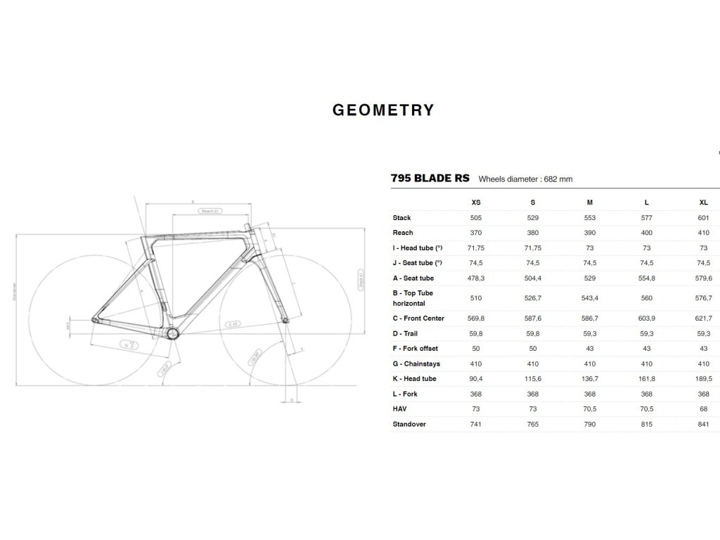 Rám modelu 795 BLADE RS má hmotnosť iba 890 gramov (vo veľkosti S) a hmotnosť celého zostaveného bicykla je len 7 kg, čo ho radí medzi najľahšie závodné stroje v jeho kategórii. Rám je vyrobený zo špeciálnej zmesi karbónových vlákien s prevahou vlákien Ultra High Modulus, ktoré zaisťujú výnimočný pomer hmotnosti a tuhosti. Navyše každý tvar, hrúbka steny a spoj sú navrhnuté pre dokonalé dynamické vlastnosti a vysokú životnosť bicykla.Geometria je prispôsobená pre závodné použitie a optimalizuje pozíciu jazdca pre maximálnu aerodynamiku a prenos výkonu. Bicykel je výnimočne stabilný vo vysokých rýchlostiach a ponúka bezchybné ovládanie. V kombinácii s prvotriednymi komponentmi stelesňuje spojenie technologickej inovácie, aerodynamiky a výnimočnej ľahkosti.