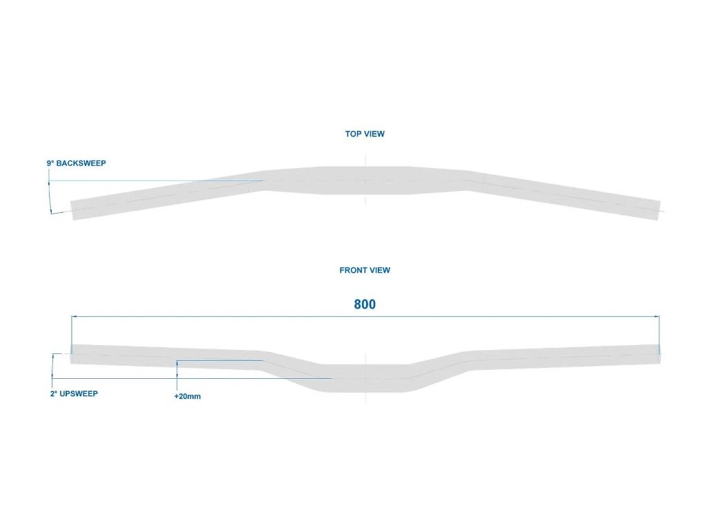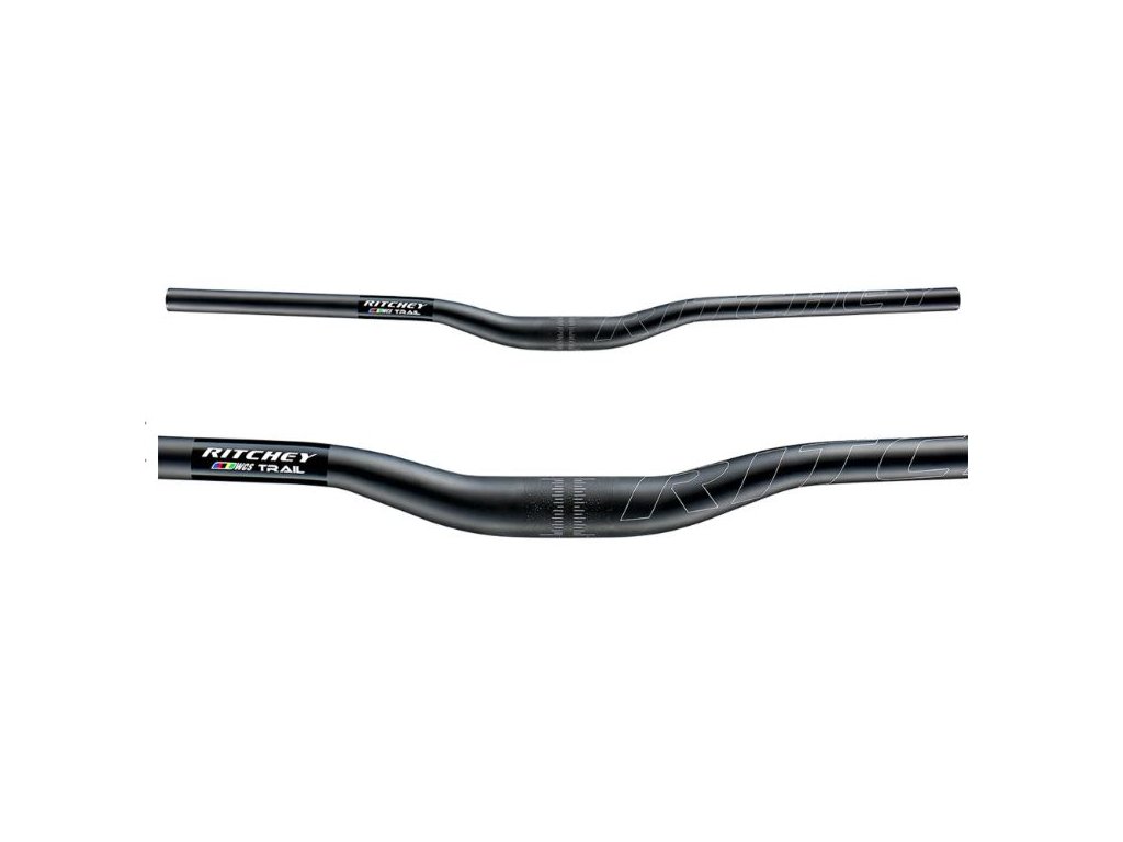 Trailové MTB riadidlá Ritchey z radu WCS Trail so zdvihom 20 mm, so zahnutím vzad 9 stupňov a nahor 2 stupne.Vyrobené sú z trojito zoslabovanej hliníkovej zliatiny AL7050 a v šírke 800 mm vážia len 284 g.