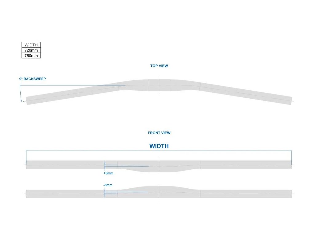MTB riadidlá šírky 760 mm, materiál triple-butted 7050 alloy, 9 st. backsweep, rise +/- 5 mm, priemer riadidiel 31,8 mm, hmotnosť 245 g.