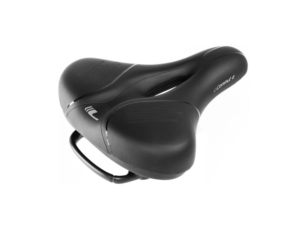 Komfortné sedlo COMUT-E je konštrukčne predurčené pre pohodlnú jazdu v mestských podmienkach a ľahkom teréne. Absolútny komfort zabezpečujú dva nezávislé pružiace systémy. Redukcia nárazového tlaku sedla a absorbcia nárazov sedla na sedacie kosti je zabezpečená umiestnením vrstvy pamäťovej peny, ktorá rozkladá tlak na väčšiu plochu a prispôsobuje sa tvaru tela. Pod ňou umiestnená vrstva peny s vyššou hustotou zabezpečuje tlmenie vibrácií a zvyšuje stabilitu. Znížený stredový pás a stredový otvor redukuje tlak v oblasti medzi sedacími kosťami a zvyšuje odvetranie. Druhý systém je umiestnený pod sedlom, kde väčšinu vibrácií od kolesa zachytí vnútorná vinutá pružina a zostatok vonkajší elastomer. Elastomer prekrýva pružinu, takže sa nemusíte báť zacvikvutia prstov alebo predmetov v pružine. Súčasťou pružiaceho systému je aj madlo, ktoré umožňuje pohodlné ochopenie bicykla. Odolný zvršok zabraňuje pokĺznutiu na sedle počas jazdy. Pevné oceľové koľajničky zvyšujú životnosť sedla.