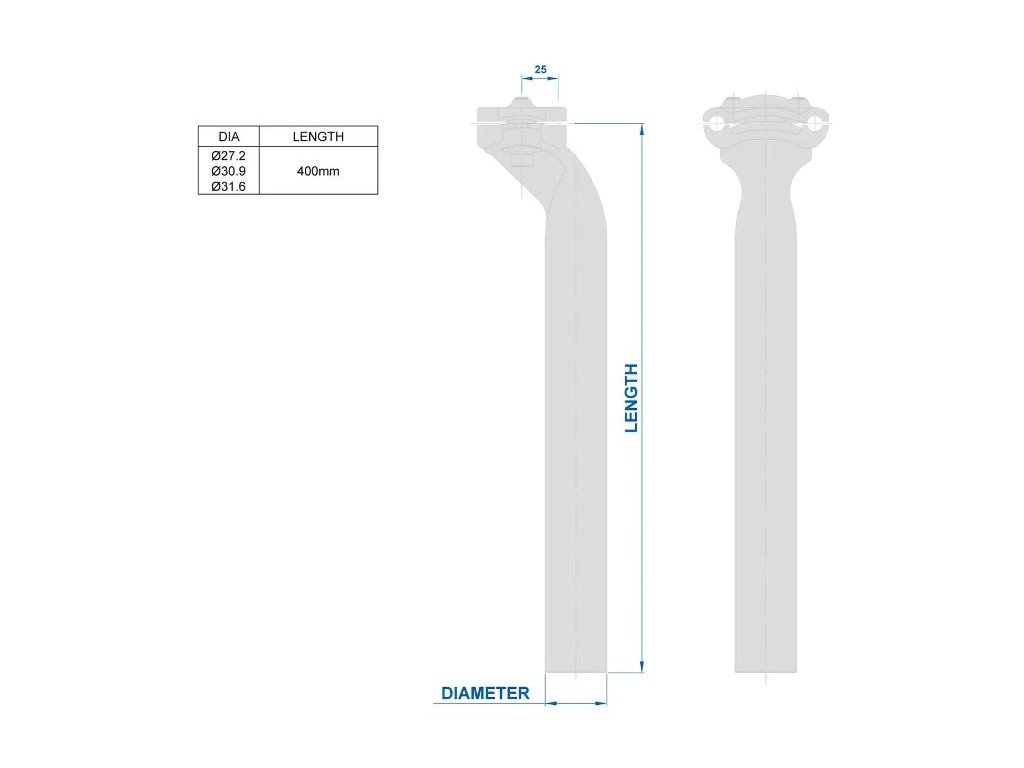 Hliníková sedlovka, dĺžka 400 mm, rôzne priemery, AL 6061, offset 25 mm, hmotnosť 310 g.