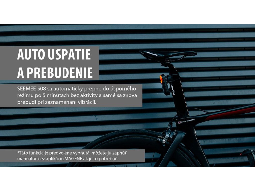 Prostredníctvom štandardného protokolu ANT+ radaru je možné SEEMEE 508 pripojiť k cyklopočítačom, hodinkám alebo iným zobrazovacím zariadeniam. Zariadenie poskytuje vizuálne a zvukové upozornenia pomocou displeja na zozadu blížiace sa vozidlá a to až na vzdialenosť 140 metrov, pomáhajúc jazdcom ostať v plnej pohotovosti. Ak sa vozidlo priblíži do vzdialenosti 140 m, zadné svetlo prejde do režimu blikania, čím upozorní približujúce sa vozidlo, aby sa držalo v bezpečnej vzdialenosti a tým pádom ochráni cyklistu pred bezpečnostnými rizikami. SEEMEE 508 je taktiež vybavené vstavaným, vysoko precíznym akcelerátorom, ktorý dostatočne rýchlo rozpozná brzdenie a 3 sekundovým blikaním identifikuje hoci aj mierne brzdenie, pričom ignoruje otrasy a malé nerovnosti, aby sa predišlo chybnej aktivácii. Svetlo prejde po 5 minútach nečinnosti do režimu spánku a automaticky sa aktivuje pri akýchkoľvek opätovných vibráciách. Ovládanie SEEMEE 508 je veľmi jednoduché. Dlhým stlačením spínača sa zapína a vypína zadné svetlo a krátkym stláčaním je možné prechádzať 6 režimami (STÁLE SVETLO, BLIKANIE, PULZ, PELOTÓN, ROTÁCIA, IBA RADAR). Pomocou aplikácie MAGENE Utility APP je možné prednastaviť zapnutie/vypnutie radaru v hociktorom režime osvetlenia, pre vami preferované nastavenie. Taktiež je možné prispôsobenie intervalu blikania/pulzu a exkluzívneho režimu. So štvrťotáčkovým držiakom možno SEEMEE 508 jednoduchým pootočením pripevniť alebo odpojiť. Integrovaná gumená podložka je kompatibilná s okrúhlymi aero sedlovkami v tvare D. Bezpečnostná šnúrka zabraňuje poškodeniu náhodným odistením. Svetlo je napájané nabíjateľnou batériou s výdržou až 16 hodín a obľúbeným nabíjacím portom USB-C s funkciou rýchleho nabíjania. Svetlo je plne nabité za približne 3 hodiny. Precízne spracovanie a kvalitné materiály robia SEEMEE 508 ideálnym spoločníkom pri bezpečnom zdolávaní cestných dobrodružstiev. Svetlo je IPX7 vodotesné, čo ho určuje do každého počasia.