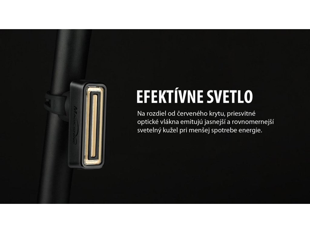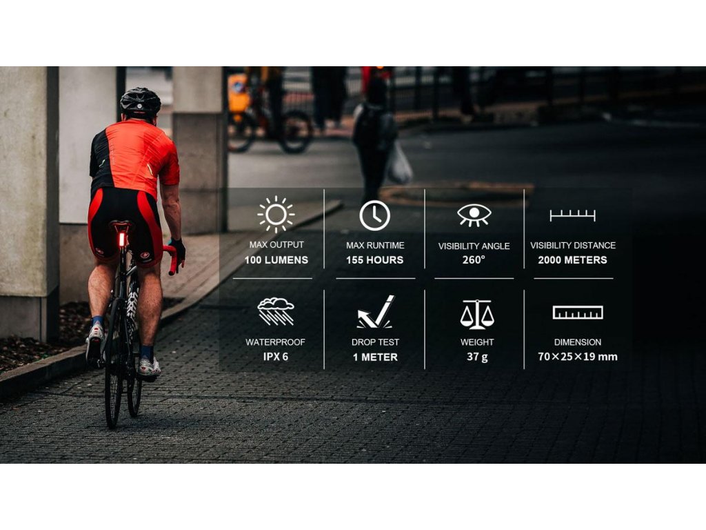 Max výkon: 100 lm; Max. prevádzkový čas: 12 hod; Viditeľnosť: 260°; Vzdialenosť: 2000 m; Nabíjačka: micro USB; Vodeodolnosť: IPX6; Systém upevnenia: popruh, úchop na sedlo; Rozmery: 27x17x73 mm; Váha: 36 g