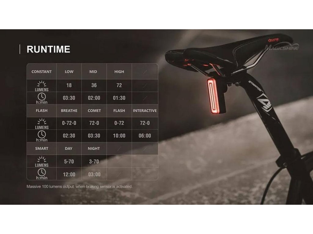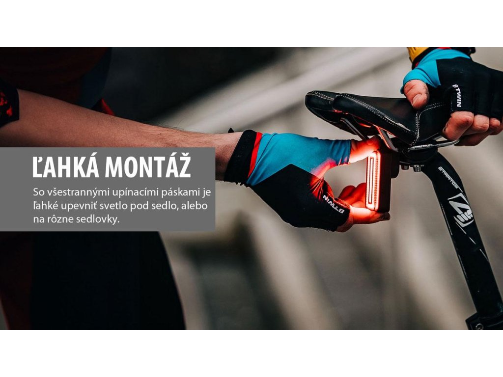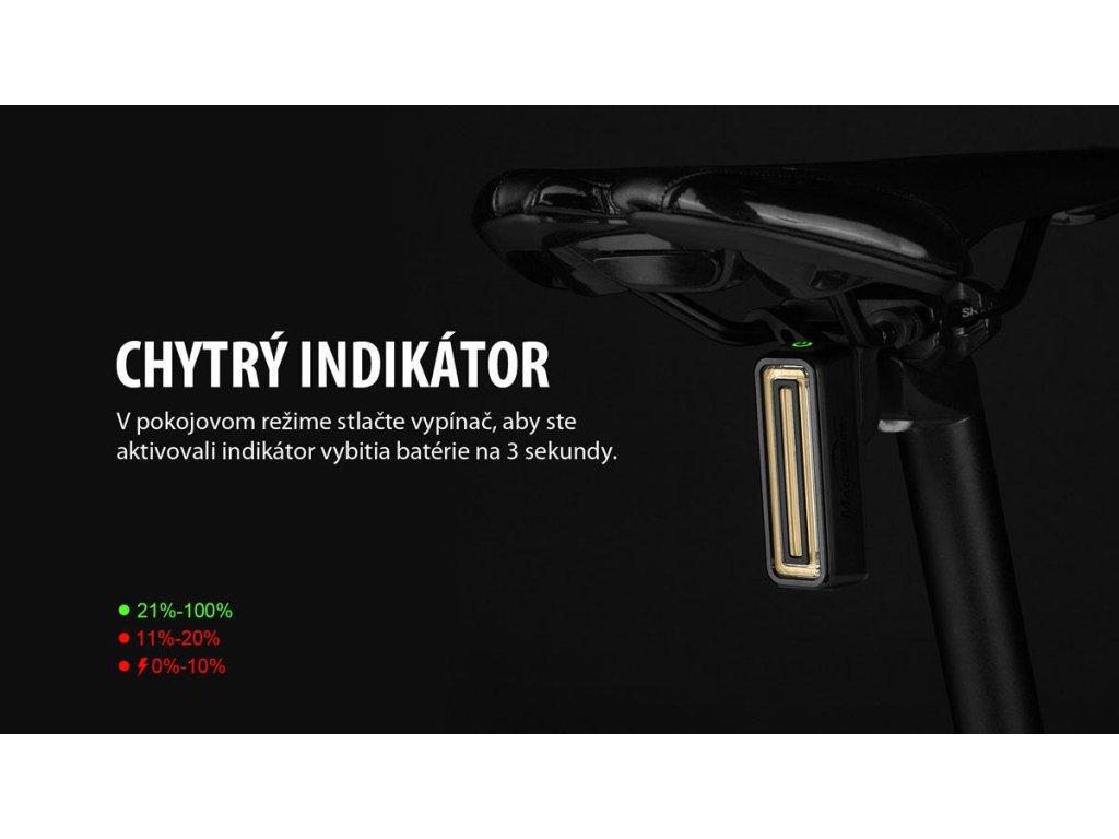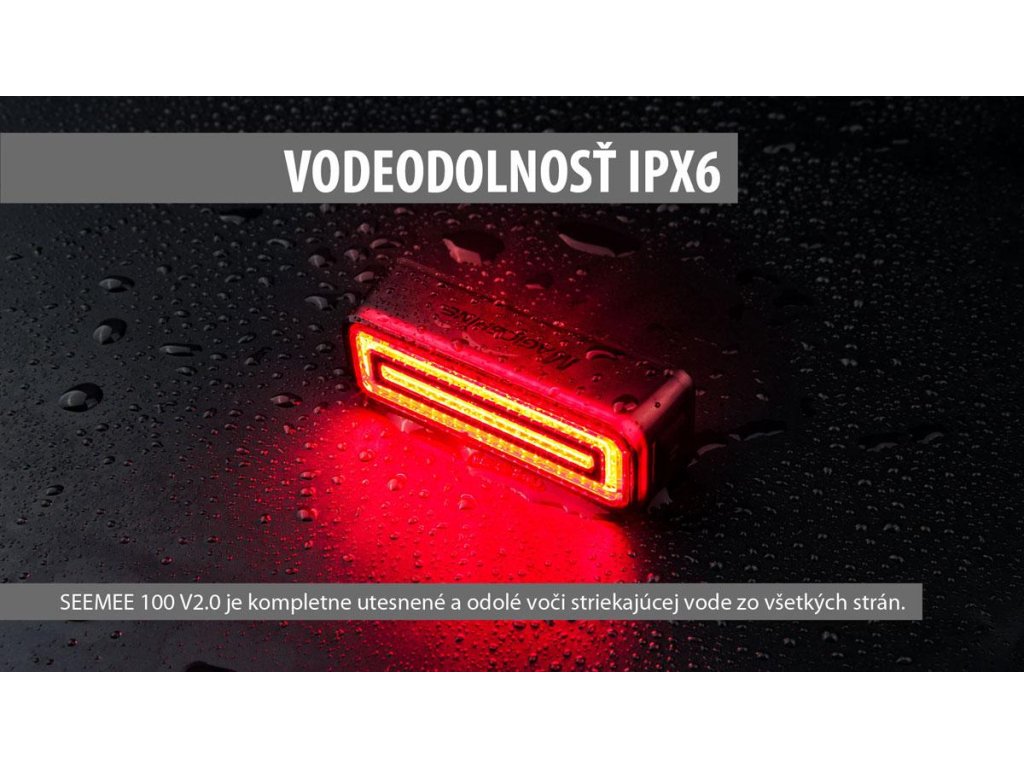 SEEMEE 100 je nová generácia USB nabíjateľných zadných svetiel s inteligentným pohybovým a svetelným senzorom a maximálnym výkonom až 100 lm. Vynikajúci výkon svetla SEEMEE 100 umožňuje viditeľnosť až na 2000 metrov a efektívne odlíši jazdca od premávky. Inteligentný senzor pohybu sa pri brzdení automaticky aktivuje a rozsvieti svetlo v maximálnej intenzite 100 lm na 3 sekundy. Vstavaný senzor takisto automaticky mení režim svietenia podľa vonkajšieho prostredia, čím zvyšuje efektivitu svietenia. Keď je úroveň nabitia batérie nižšia ako 5 %, svetlo sa automaticky prepne do ekonomického režimu blikania (18 lm), s dodatočnou výdržou až 20 min. Priesvitný kryt po stranách pevného puzdra poskytuje vysokú viditeľnosť svetla zo všetkých strán, čo umožňuje jazdcom byť videný zo všetkých strán. Stlačením tlačidla v pohotovostnom režime na 3 sekundy sa aktivujte indikátor batérie. Vďaka všestrannému systému uchytenia je možné svetlo ľahko namontovať pod sedlo alebo na rôzne typy sedloviek. SEEMEE100 disponuje vynikajúcim stupňom vodeodolnosti IPX6. Dvojitým kliknutím zmeníte režim a krátkym kliknutím prejdete cez nastavenia jasu a funkciu pamäte pre rýchly štart.