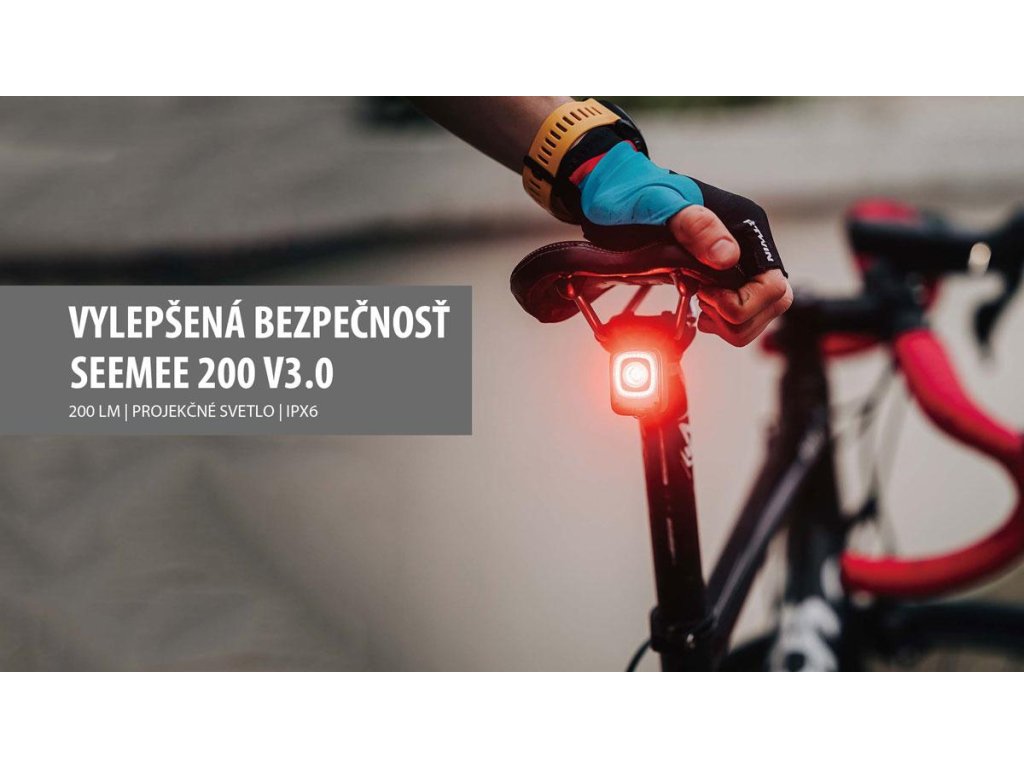 SEEMEE 200 V3.0 je úplne nová vylepšená verzia predchádzajúceho modelu SEEMEE 200 a jedno z najvýkonnejších zadných svetiel na trhu. Extra výkonné a pútavé zadné svetlo s elegantným dizajnom v tvare kocky, ktorého maximálny výkon môže dosiahnuť až 200 lm. SEEMEE 200 Je vybavený až dvomi šošovkami: hlavným svetlom a pod ním umiestneným tzv. "sledovacím svetlom". Funkcia OptiTracing premieta 360-stupňový oblúk červeného svetla na cestu, čím výrazne zvyšuje efekt výstrahy. Vďaka priesvitnému krytu vrhá hlavná šošovka 260-stupňový lúč, ktorý dostatočne osvetlí cestu aj pri odbočovaní. Stlačením a podržaním tlačidla zapnete alebo vypnete svetlo a krátkym stlačením vyberiete medzi rôznymi jasmi a režimami. Chceli by ste niekedy jazdiť s priateľmi dlhší čas? SEEMEE 200 vám to v novej verzii umožní s režimom blesku pre skupinovú jazdu, ktorý vyžaruje iba 10 lm a poskytuje až 50 hodinovú výdrž. Okrem toho sme nanovo definovali aj inteligentný režim, s ktorým môžete počas dňa používať maximálny výkon 200 lm, čo výrazne zvyšuje bezpečnosť jazdy počas dňa. Max výkon 200 lm, 360° sledovacie svetlo, snímač pohybu, snímač jasu, IPX6, super jednoduché ovládanie a dlhšia doba prevádzky robia zo SEEMEE 200 V3.0 jedno z najlepších zadných svetiel na svete.