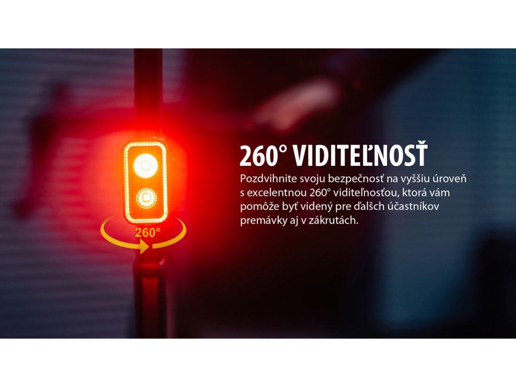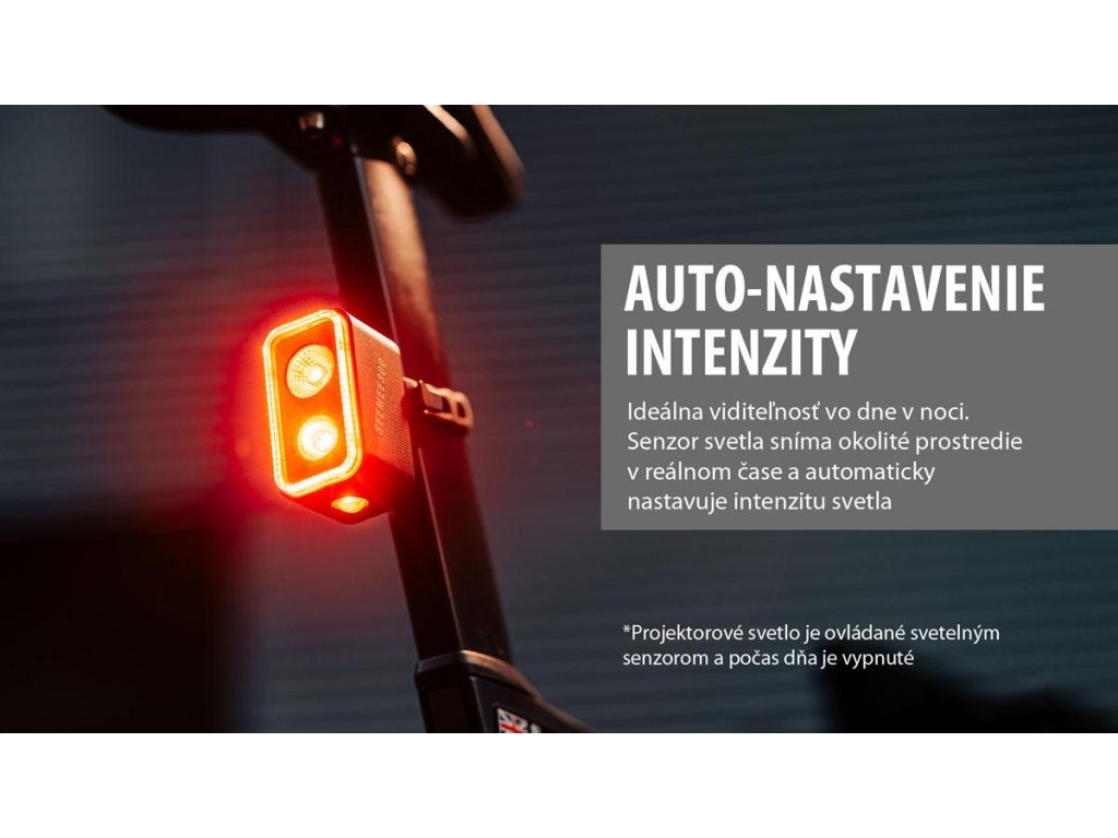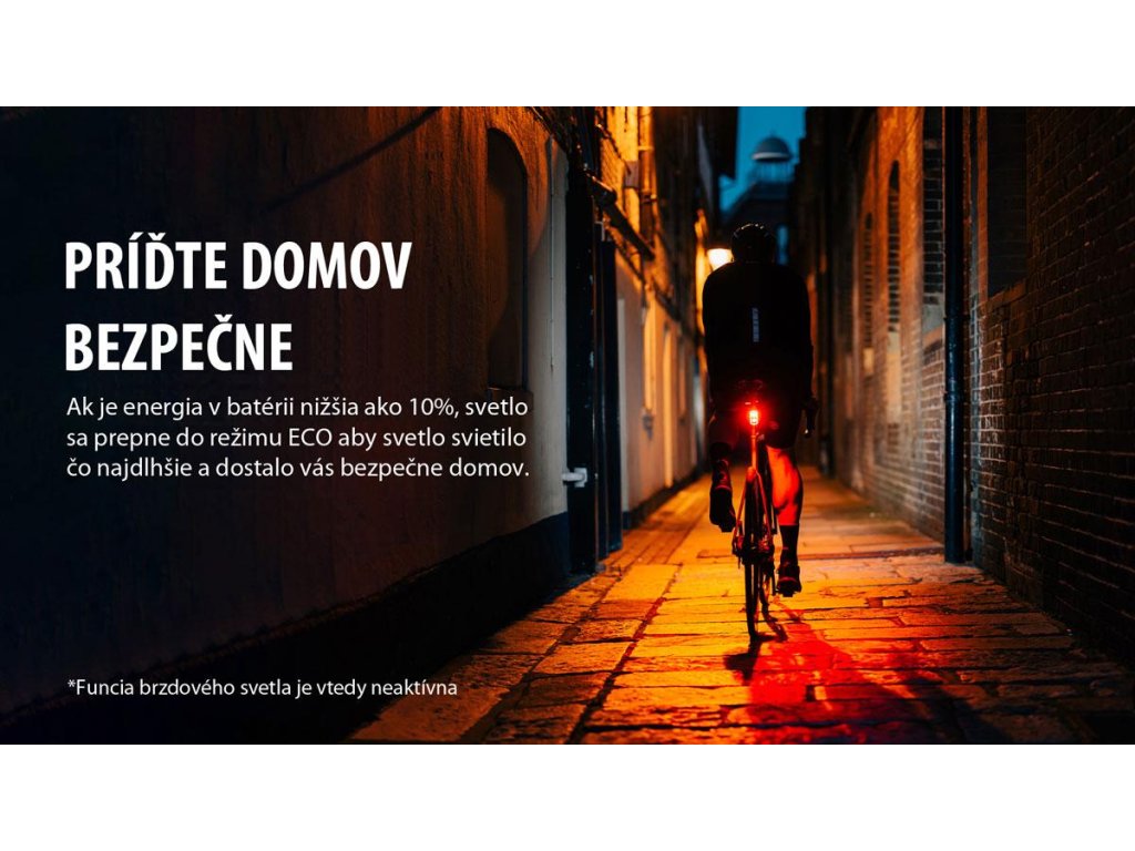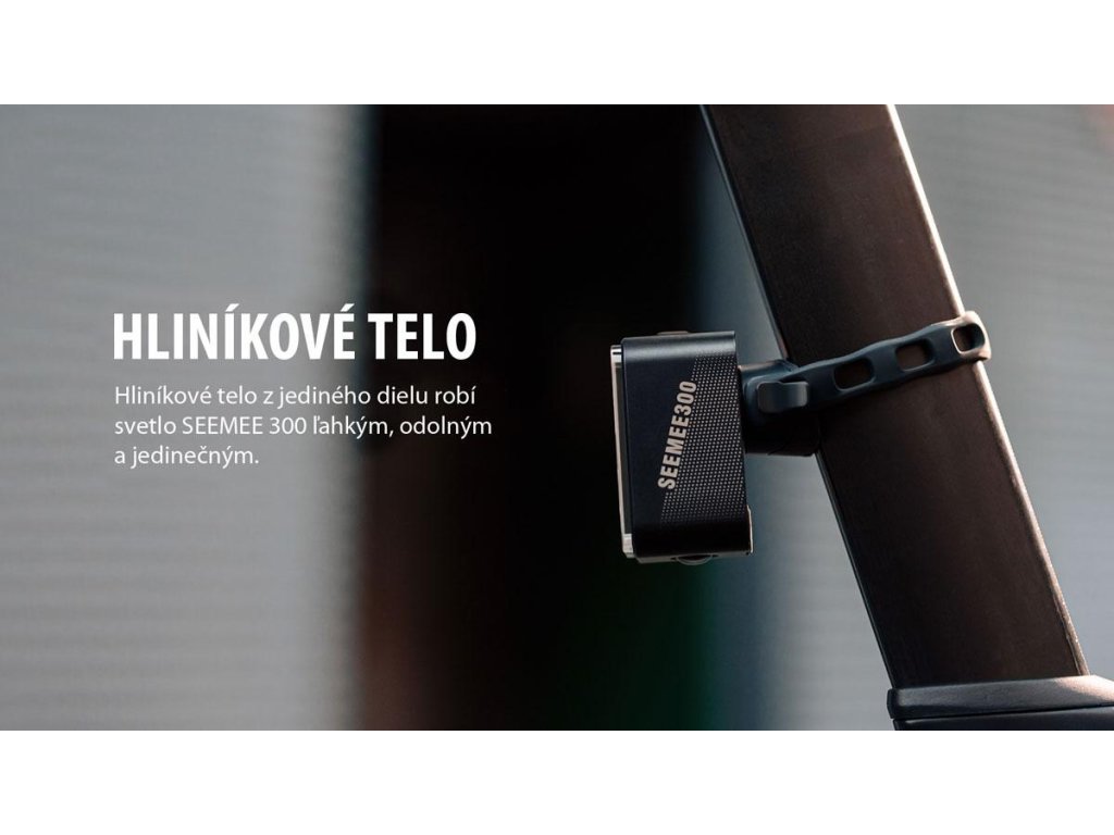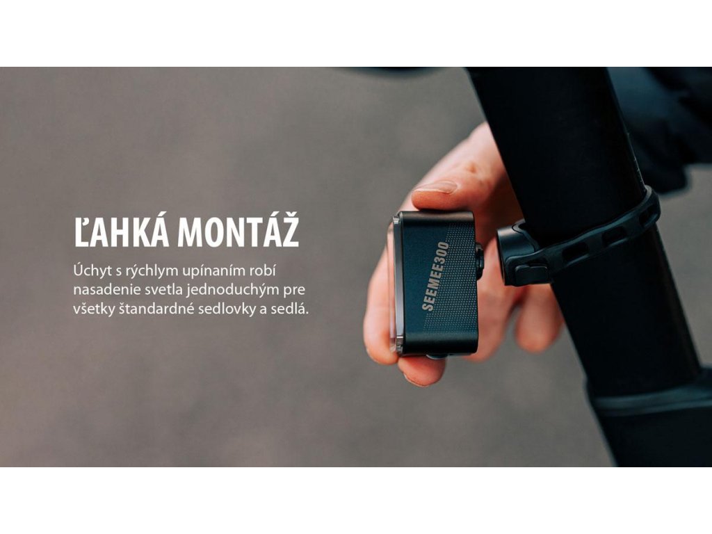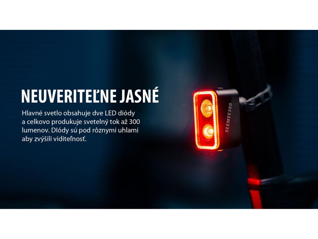 SEEMEE 300 je pôsobivé a výkonné zadné svetlo vhodné na jazdu na ceste, jazdu v meste ako aj každodenné dochádzanie. Obsahuje dva svetelné zdroje, hlavné svetlo a svetlo OptiTracing. Hlavné svetlo sa skladá z dvoch LED diód. Maximálny výkon svetla je 300 lm a má rôzne uhly šošoviek pre lepšiu viditeľnosť. Okrem toho môže premietať 360° červené kúželovité, výstražné svetlo OptiTracing, ktoré prináša všestrannú viditeľnosť, vďaka čomu budete na ceste viditeľnejší a bezpečnejší. Zabudovaný pohybový senzor rozpozná váš pohyb a pri brzdení automaticky zvýši jas (300 lm), čím môžete efektívne varovať za vami idúcich účastníkov cestnej premávky a zvýšiť tým svoju bezpečnosť. Funkciu brzdy je taktiež možné zapnúť/vypnúť manuálne a tým predĺžiť dobu prevádzky. Senzor okolitého svetla navyše dokáže automaticky upraviť jas zadného svetla v závislosti od vonkajších podmienok, čo vám umožní sústrediť sa na cestu pred vami.. Režim Smart-Day Flash ponúka maximálnu viditeľnosť počas dňa. Režim nízkej spotreby vás bezpečne privedie domov skôr, ako sa vybije batéria. 5 režimov svietenia: 50%-100%-BLIKANIE-ECO a SMART. Jednodielne hliníkové puzdro zaručuje okrem ľahkosti a odolnosti aj vkusné prevedenie. Rôzne možnosti uchopenia zjednodušujú upevnenie k sedlu alebo rôznym typom sedloviek. K prepracovanému dizajnu sa pridávajú aj funkcia pamäte režimu, trojúrovňový indikátor a možnosť nabíjania pomocou USB-C kábla. Vodotesnosť IPX6 zaručuje odolnosť aj proti silnému dažďu.