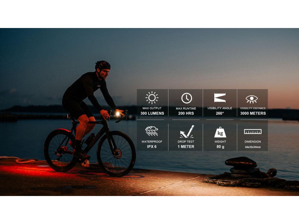 Max výkon: 300 lm; Max. prevádzkový čas: 200 hod; Doba nabíjania: 1.5 hod (5V 1A); Batéria: 3.7V 1600mAh; Viditeľnosť: 260°; Vzdialenosť: 3000 m; Nabíjačka: USB-C; Vodeodolnosť: IPX6; Systém upevnenia: Quick-release popruh; Rozmery: 64x32x35 mm; Váha: 80 g