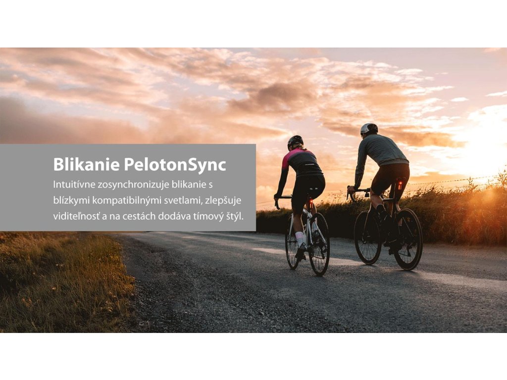 Priekopnícka technológia PelotonSync Flash, prispôsobená pre tímové dobrodružstvá, intuitívne harmonizuje módy blikania medzi blízkymi kompatibilnými zariadeniami. To podporuje súhru medzi jazdcami a zároveň zaisťuje optimálnu viditeľnosť, čo vedie k bezproblémovému spojeniu bezpečnosti so skupinovou dynamikou.
