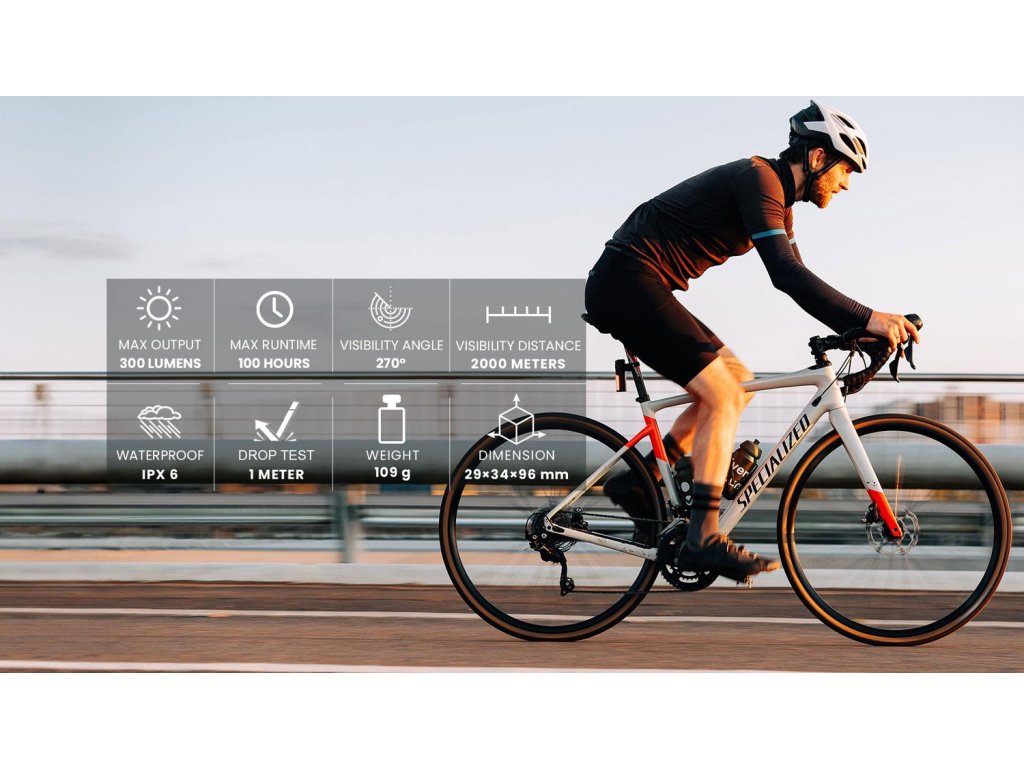 SEEMEE R300 je robustná jednotka s výkonnou 3350mAh batériou, ktorá ponúka až 100 hodín prevádzky. Režim eco-flash predlžuje životnosť batérie bez ohrozenia bezpečnosti. Indikátor batérie umožňuje rýchlu kontrolu stavu batérie. Taktiež obsahuje bezpečnostný zámok, ktorý zabraňuje náhodnej aktivácii. Zariadenie je vodotesné IPX6, čo zaisťuje spoľahlivosť za každého počasia. Uchopenie je riešené všestranným štvrťotáčkovým držiakom, ktorý možno bezpečne uchytiť na rôzne typy sedloviek, čo z neho robí spoľahlivého a univerzálneho spoločníka.