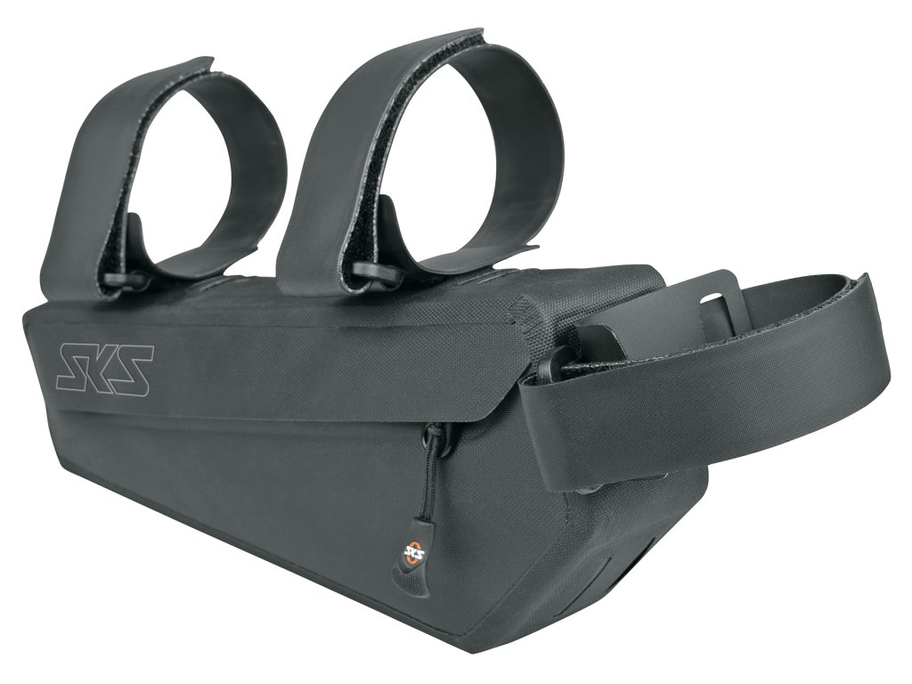RACE FRAME BAG je nevyhnutnosťou pre cestných cyklistov a gravel bikerov. Vďaka odolnému vonkajšiemu materiálu so zváranými švami je taška na bicykel vhodná do všetkých poveternostných podmienok. Bočný zips Easyzip je chránený krytom a dve vnútorné vrecká poskytujú priestor na peniaze a ďalšie drobnosti. Taška je tiež vybavená reflexným logom a praktickými držiakmi zadných svetiel.Vhodná ako taška do rámu alebo na sedlovkuDo rámového trojuholníka sa vďaka úzkemu dizajnu tašky SKS ľahko zmestia aj fľaše na pitie. Tašku možno bezpečne namontovať na rám bicykla alebo sedlovku pomocou extra dlhých protišmykových suchých zipsov s ochranou rámu. Je možné ju namontovať aj na aero sedlovky, pričom háčiky a suché zipsy sa dajú skrátiť a vymeniť. Pogumovaná horná časť tašky chráni lak a poskytuje podporu na všetkých cestách.- Zváraný vonkajší materiál odolný proti striekajúcej vode - Skracovateľný suchý zips s ochranou rámu - Dve vnútorné vrecká, reflexné prvky - Vhodná aj pre aero sedlovky - Materiál: Polyester - Hmotnosť: 90 g - Objem: 650 ml - Rozmery: 230 x 40 x 100 mm