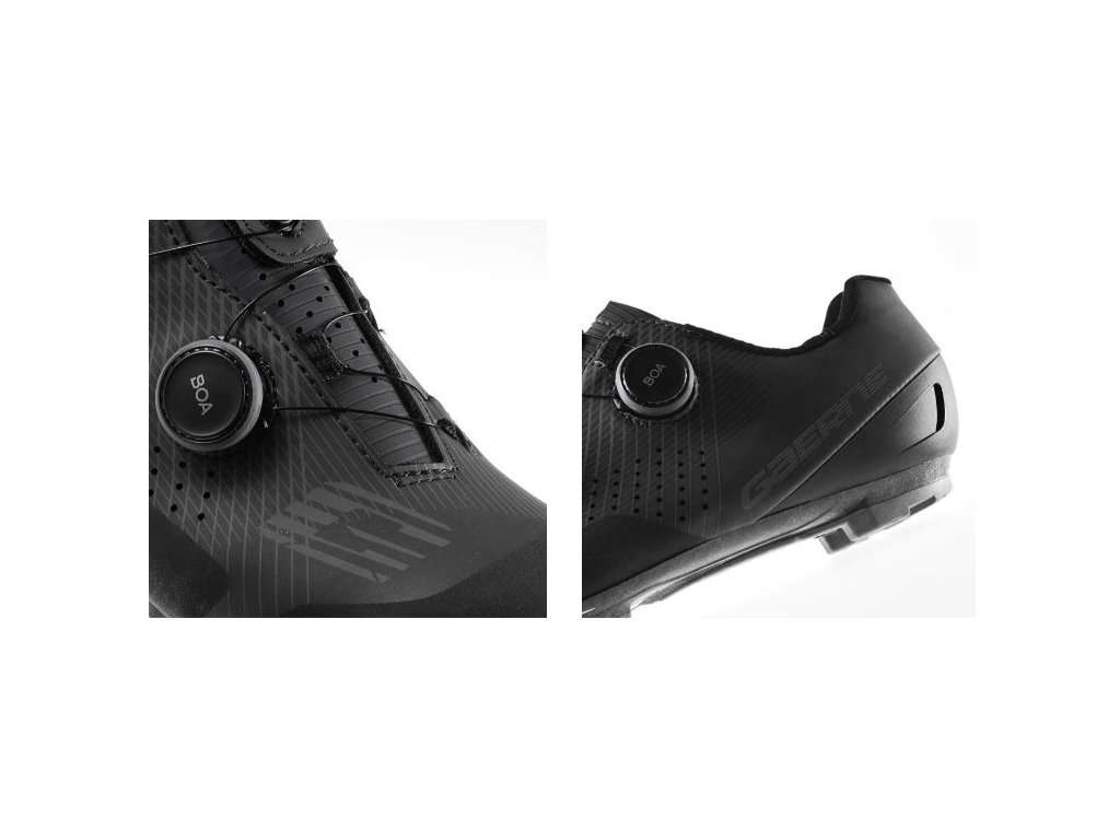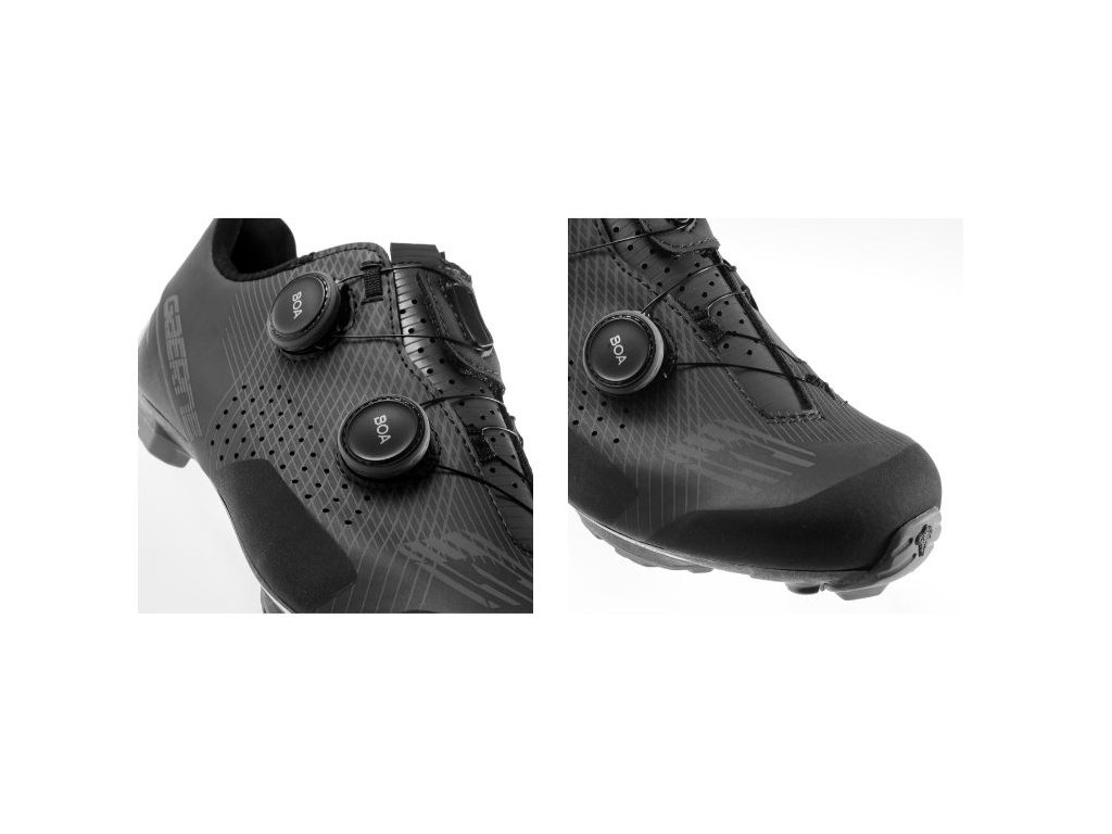 Materiál z mikrovlákna je strategicky perforovaný, aby maximalizoval priedušnosť, zlepšil ventiláciu a udržiaval vaše nohy v chlade a suchu počas celej jazdy.Vnútro tretry je kombinované so sieťovinou, ktorá poskytuje dlhodobú oporu chodidla a zvyšuje stabilitu. TPU na špičke a bokoch chráni proti oderu a zvyšuje odolnosť.DUAL FITTING CLOSURE SYSTEM, vybavený dvomi kolieskami BOA Dial Z, ponúka presné prispôsobenie nartu aj prednej časti chodidla. Tento systém zabezpečuje rýchle a individuálne stiahnutie bez tlakových bodov.Model L6 DIAL Z, známy svojim aerodynamickým dizajnom, je vybavený optimalizovaným pogumovaným povrchom, ktorý zabezpečuje efektívny a bezpečný úchop.FIT TONGUE 1.0 je dokonale navrhnutý a obsahuje high-tech tlmiacu vrstvu pre väčšie pohodlie a lepšiu priedušnosť.Integrovaný protišmykový pätový košík zlepšuje stabilitu chodidla a kontrolu nad ním, čím prispieva k ešte lepšiemu zážitku z jazdy.EPS TRANSPIRANT INSOLE poskytuje anatomickú podporu pre maximálne pohodlie a efektívny prenos energie pri šliapaní.Podrážka Gaerne EPS Lightweight Carbon Fiber MTB Sole 10.0, vyvinutá v spolupráci s Michelin®, kombinuje karbónovú konštrukciu pre vynikajúcu tuhosť a nízku hmotnosť, čím zaisťuje výkonné šliapanie.Pryžový behúň Michelin® poskytuje maximálnu odolnosť voči oderu a vynikajúcu trakciu aj v extrémnych podmienkach.Špeciálne rozmiestnenie vzoru podrážky uľahčuje samočistenie a rýchle odvádzanie blata.S indexom tuhosti 10 je táto podrážka najtuhšia v rade Gaerne MTB.CARBON G.DARE je hrdou súčasťou talianskej tradície výroby prémiovej cyklistickej obuvi.
