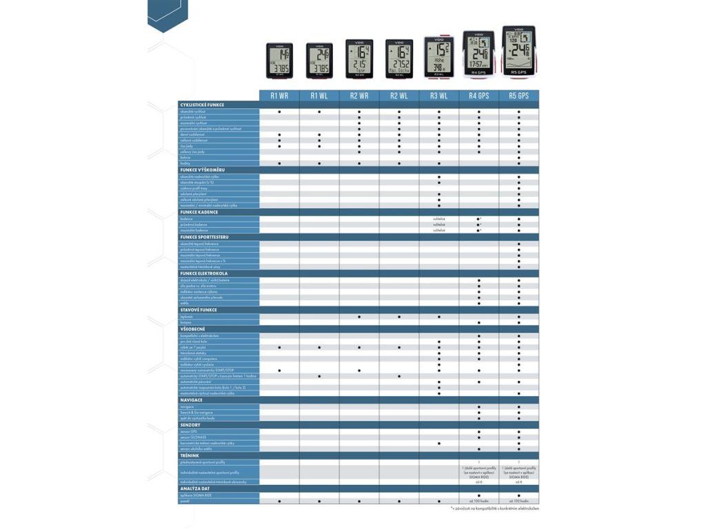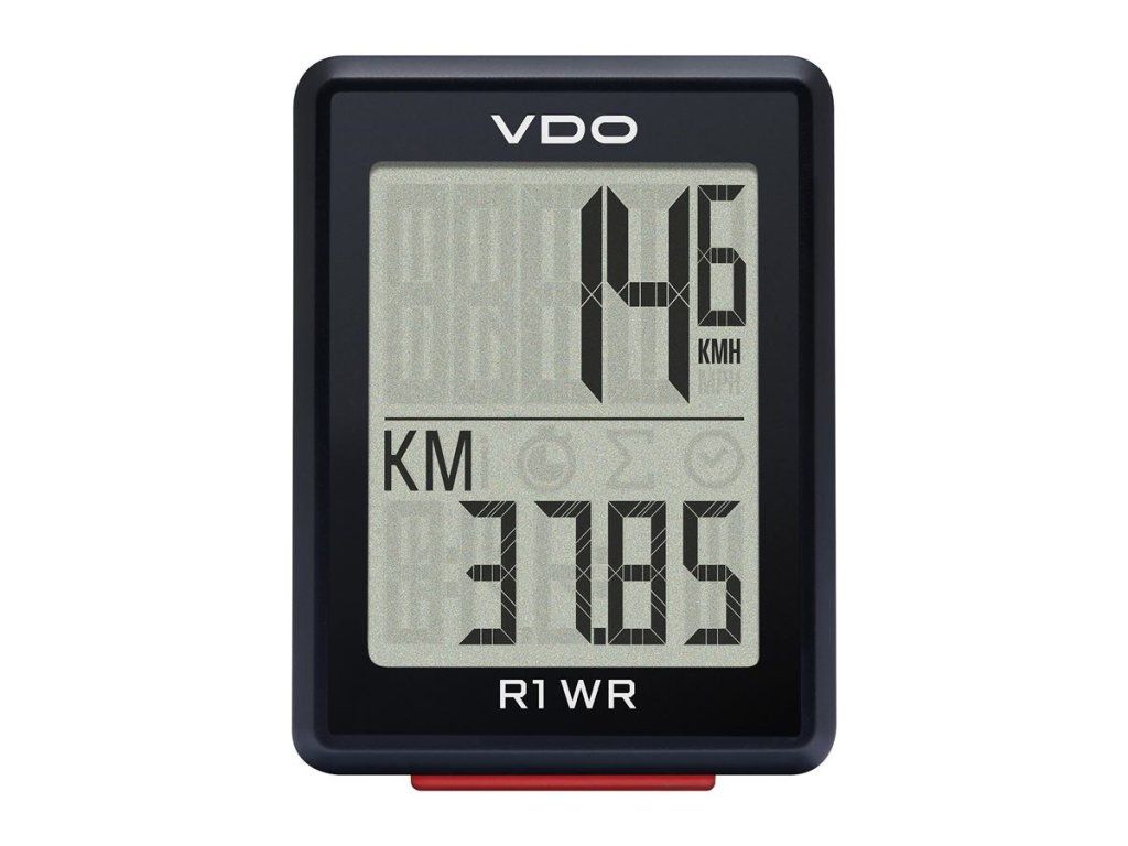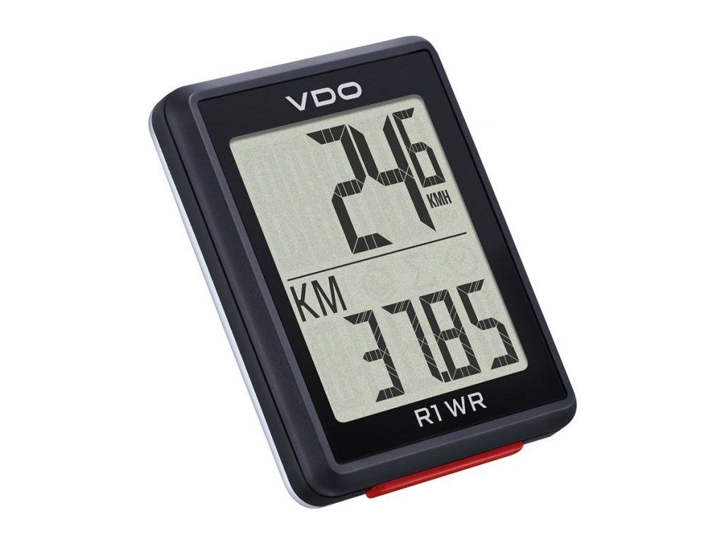 Základní drátový computer VDO R1 WR je spolehlivým společníkem pro všechny, kteří chtějí mít na svých cyklo výletech přehled o pěti nejdůležitějších hodnotách – ať už při cestě do práce nebo při víkendovém výletu na kole. Velký, snadno čitelný displej computeru zobrazuje okamžitou rychlost, denní a celkovou vzdálenost, čas jízdy a hodiny. Pro větší přehlednost jsou jednotlivé funkce označeny ikonami. Nastavení a ovládání R1 WR je velmi snadné díky výraznému červenému funkčnímu tlačítku. Díky integrované tabulce plášťů je nastavení obvodu kol snadnou záležitostí. Držák na řídítka pro vodotěsný computer lze rychle namontovat na kolo pomocí přiložených stahovacích pásků. Computer lze poté snadno vyjmout a uschovat, čímž jej ochráníte před možným odcizením. Drátové propojení vysílače a compteru zajišťuje plynulé a bezproblémové měření bez nutnosti instalace baterie do vysílače. Přiložená baterie (CR2032) postačí k napájení computeru po dobu delší než dva roky.