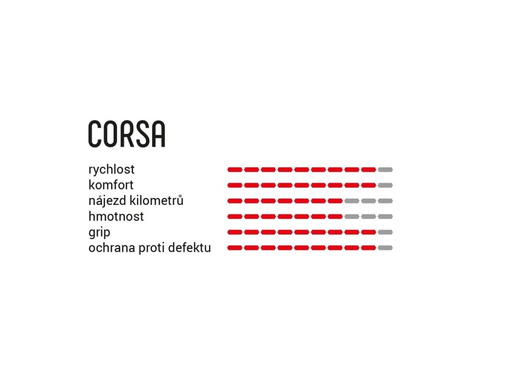 CORSA Tour de France, Giro d'Italia, Vuelta, Jarné klasiky, Majstrovstvá sveta aj Európy, alebo Olympijské hry - tam všade jazdci, ktorí stáli na pódiách na miestach najvyšších, sa spoliehali a stále spoliehajú na špičkové vlastnosti plášťov a galusiek z rodiny CORSA. Roky zbierania skúseností - nielen počas epických bitiek na vyššie spomenutých pretekoch, sme premenili na najlepší cestný plášť a galusku na svete. Za svoje vynikajúce vlastnosti vďačí nielen ručnej výrobe, bavlnenej kordovej konštrukcii 320 TPI, štyrom rôznym zmesiam v jednom behúne, ale aj inovovanej zmesi Grafen 2.0, vďaka ktorej má teraz ešte nižší valivý odpor, dlhšiu životnosť a vyššiu priľnavosť - najmä na mokre. Skladajúca kevlarová verzia. 4C - Štyri rôzne zmesi v jednom behúne. Ochrana proti defektu pod behúnen. Ručná výroba. Konštrukcia kordu bavlna 320 TPI. Inovovaná Grafen 2.0 zmes pre ešte vyššiu odolnosť, dlhší nájazd a maximálny grip na mokre.