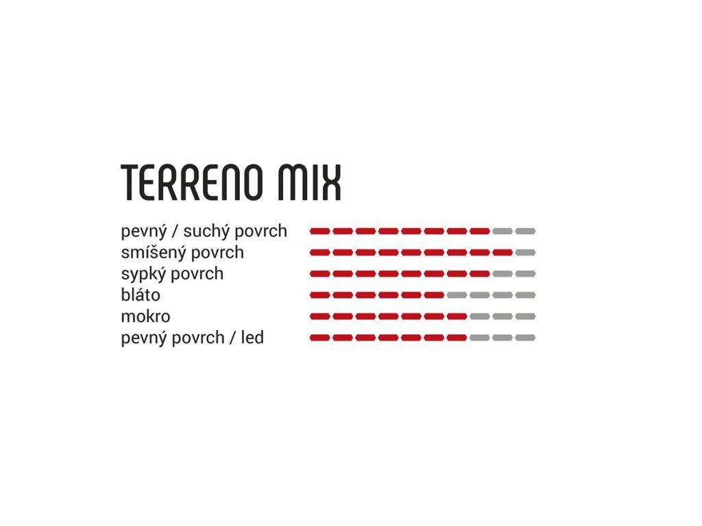 Zároveň ale velmi dobře umí i v bahně, písku, nebo na šotolině. Terreno mix je ideální a univerzální CX/GRAVEL guma, která pomůže razantně oddálit okamžik, kdy váš obličej detailně skenuje texturu povrchu právě projížděné cesty.