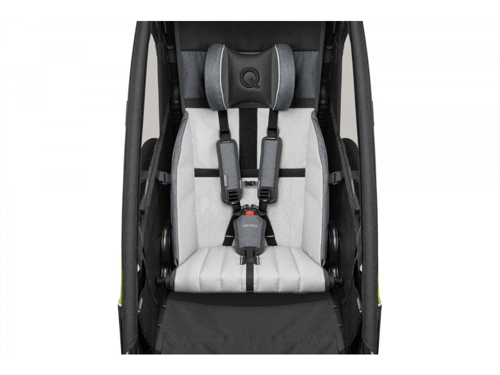 Jednomiestny odpružený detský vozík za bicykel Qeridoo Sportrex 1. Komfortné sedadlo s adaptívnym 5-bodovým pásom.