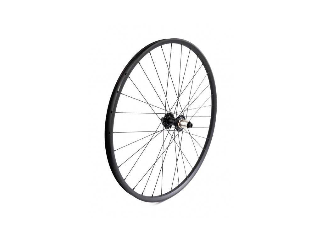 Zadné vypletené koleso pre 29" MTB bicykle, ráfik s vnútornou šírkou 25 mm a náboj s pevnou osou 12x142 mm pre použitie na cross-country a trailových bicykloch a elektrobicykloch.
