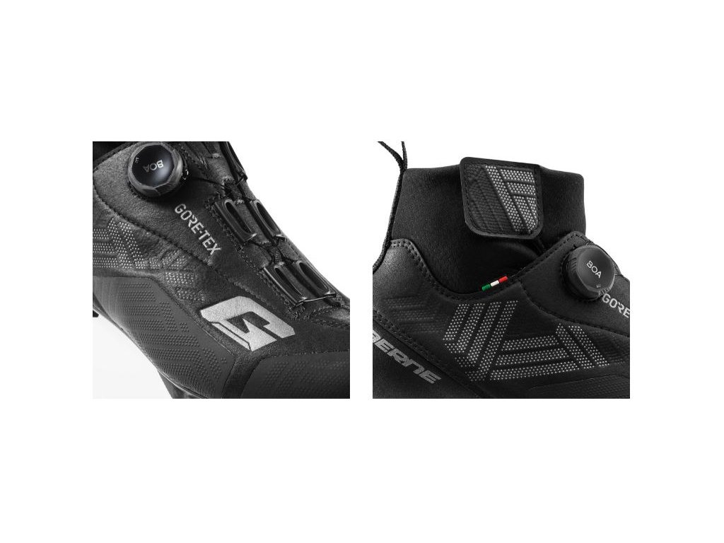 Tretry Gaerne ICE Storm GoreTex jsou ideální volbou pro extrémně chladné a deštivé počasí.Svršek tretry má membránu Gore-Tex® Duratherm®, která nabízí prodyšnost, nepropustnost a tepelnou izolaci i v těch nejintenzivnějších chladných podmínkách. Strečový lem z Gore-Tex Rattler® materiálu, zadní úchyt pro snadné nasazení a reflexní prvky pro zvýšení bezpečnosti v podmínkách snížené viditelnosti. Zesílení proti oděru v oblasti špičce a bocích tretry.Mezipodešev je vysoce izolační s přídavkem termoreflexního hliníku, je umístěn mezi podrážkou a svrškem a vytváří tepelnou bariéru, která umožňuje chodidlu zůstat v teple a suchu. Pata má protiskluzovou ochranu.Kolečko BOA IP-1 pro přesné a rychlé upnutí. Vnitřní podešev je anatomická s podporou v tarzální oblasti, která zajišťuje pohodlí a efektivitu při šlapání.Podrážka: GAERNE MTB 2DENSITY 7.0 je navržena speciálně pro použití na horských kolech. Podrážka kombinuje materiály z nylonu a laminátu, díky čemuž je odolná, lehká a tenká. Dezén byl navržen tak, aby zaručoval maximální přilnavost / stabilitu a má vynikající odolnost vůči různým typům terénu.G.ICE-STORM MTB 1.0 je hrdě vyrobena v Itálii.